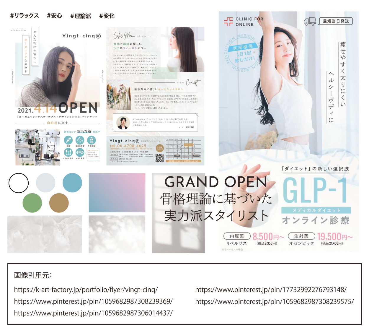 美容室の特長である「骨格理論に基づいたスタイル提案」のキャッチコピーを縦書きでチラシ上部左に載せることで、設定したペルソナに刺さる魅力を素早くアピールできるようにしました。