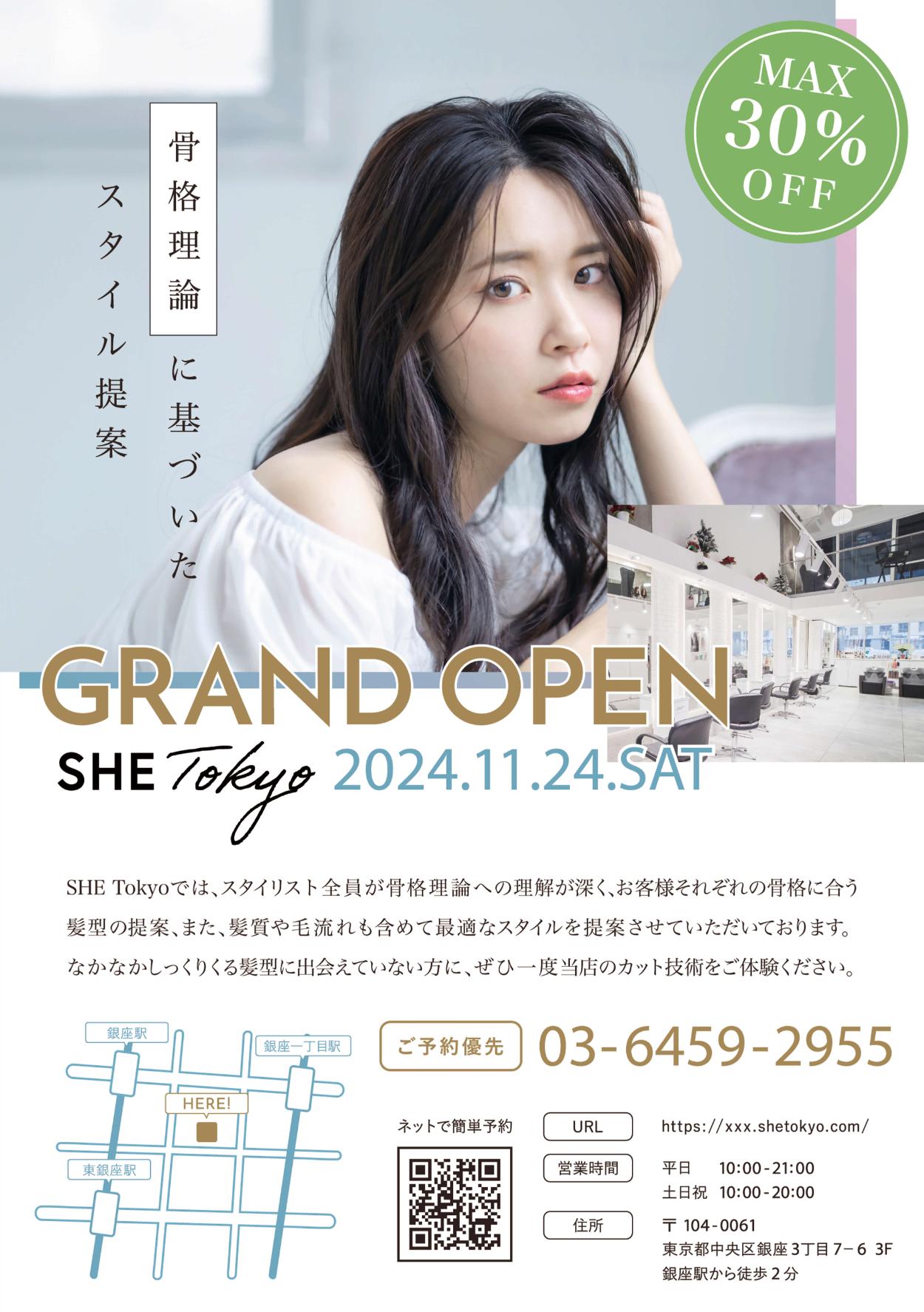具体的なキャンペーン内容かつ新規顧客へのアピールポイントである「MAX 30% OFF」をバッヂにし、縦方向チラシで最初に目線が行く右上に設置しました。