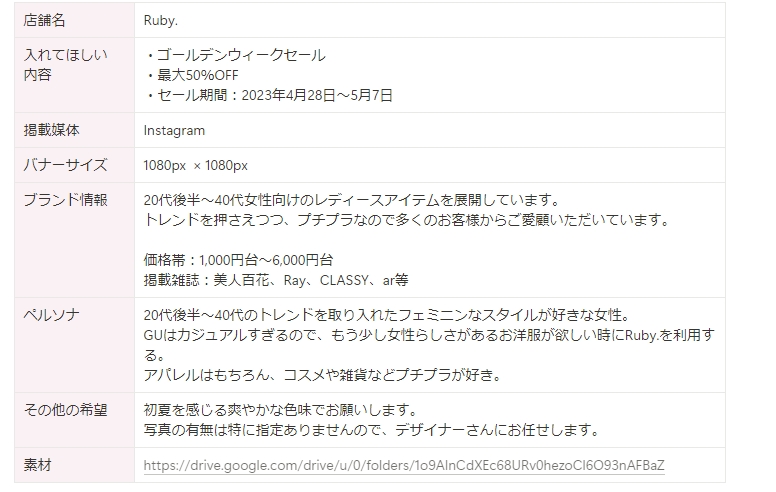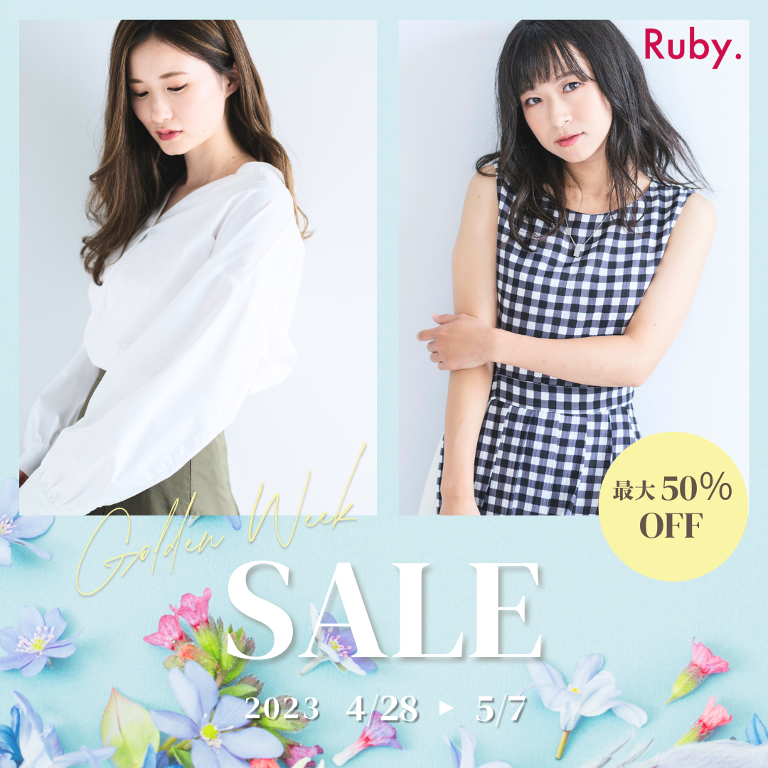 HerTechの課題に取り組みました Akane ◇こだわった点・ゴールデンウィークセールの為、初夏を感じる配色・お花をあしらい女性らしさを演出・フェミニンなスタイルが好きな女性に興味を持ってもらえるよう淡い色味