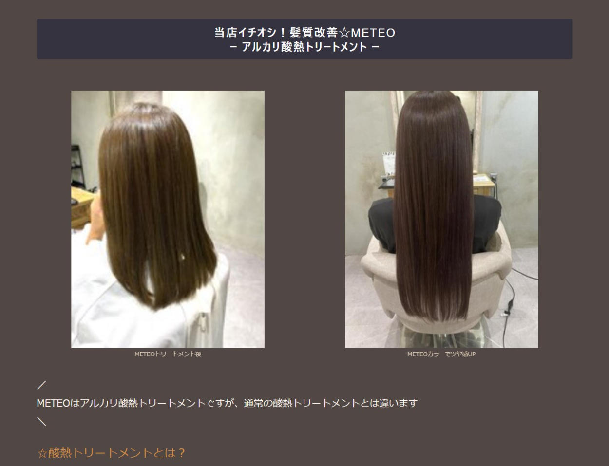 - メインのMETEOをトップページに持ってきて、髪質改善メニューをPRした。