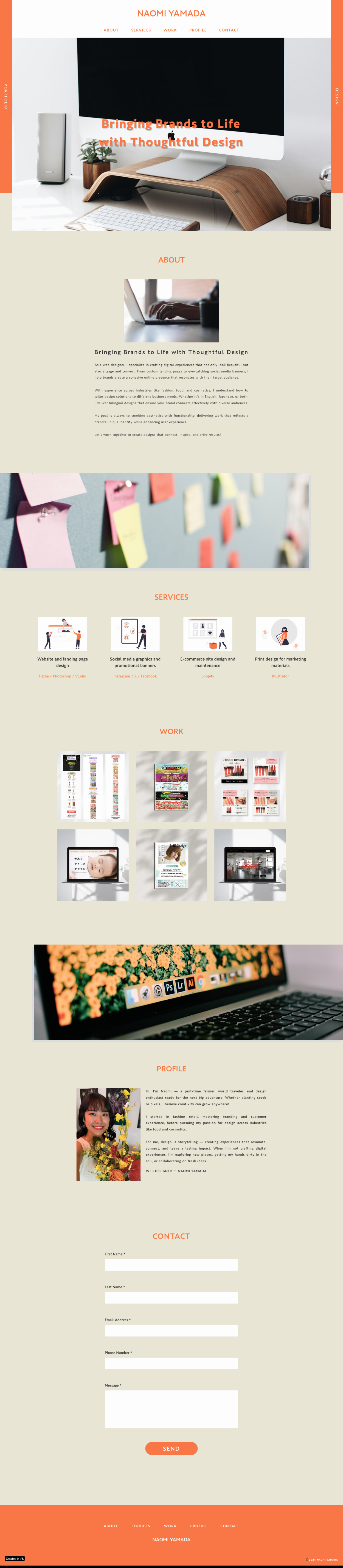 【STUDIO・Figma】英語版ポートフォリオ Naomi Yamada Web制作 / SNS運用 / ブランディング OVERVIEW Figmaにてワイヤーフレーム作成、STUDIOにて実装しました。 YEAR 2024 - 2024 https://azure258708.studio.site/ WEBSITE