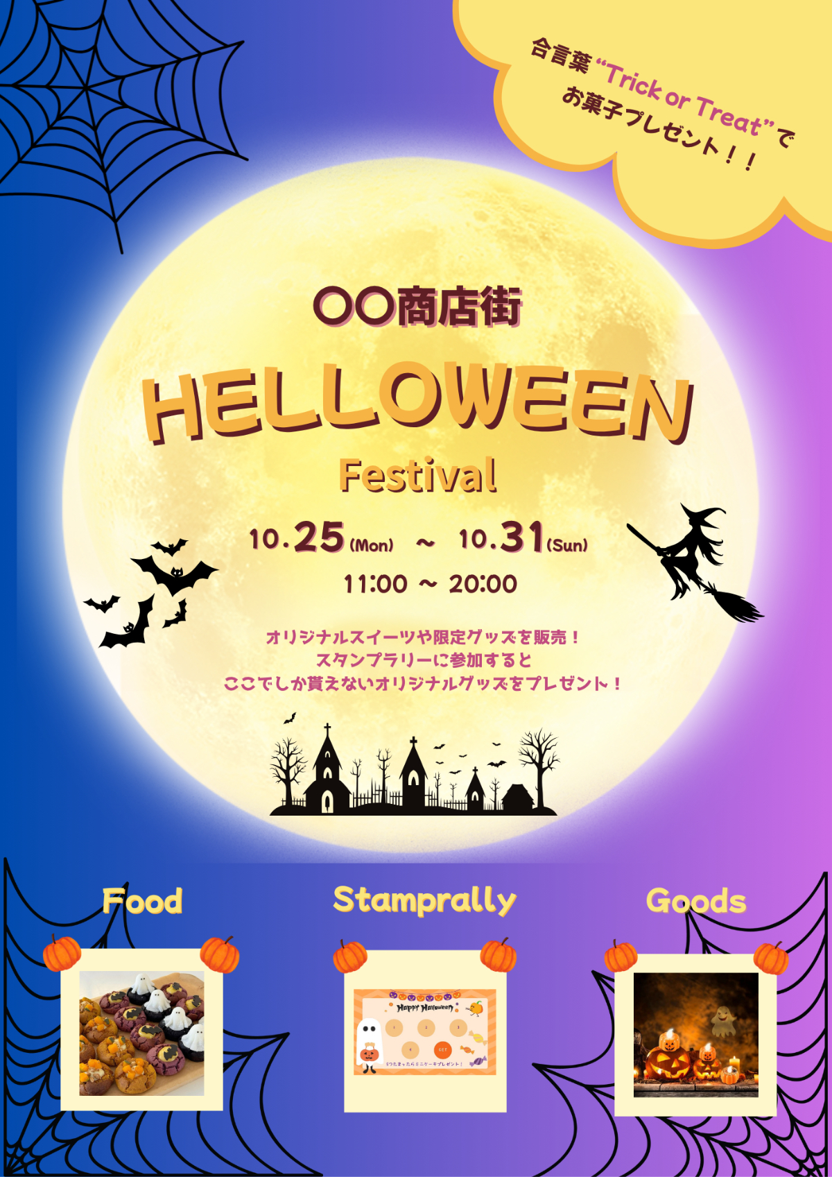 ハロウィンイベント(仮) チラシ さやか Webデザイナー OVERVIEW オリジナル制作。 商店街で開催されるハロウィンのイベントのチラシ。 架空のものなので実際には開催されません。 YEAR 2025 商店街で開催されるハロウィンイベントをテーマに制作しました。商店街に買い物をしに来るお客さん、特に子供のいる家族連れをターゲットに、明るくポップで楽しさが伝わる色合いで仕上げました。