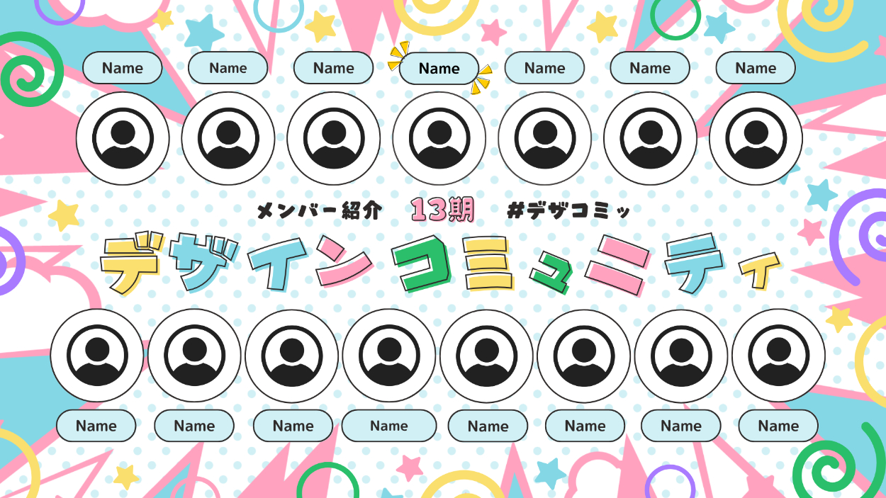 - メンバーが15人と多く、掲載しなければいけない情報が多い中で、視線が散らばらず、「デザインコミュニティ」という文字を見てもらうために、真ん中に視線が集中するような図形の配置にしました。