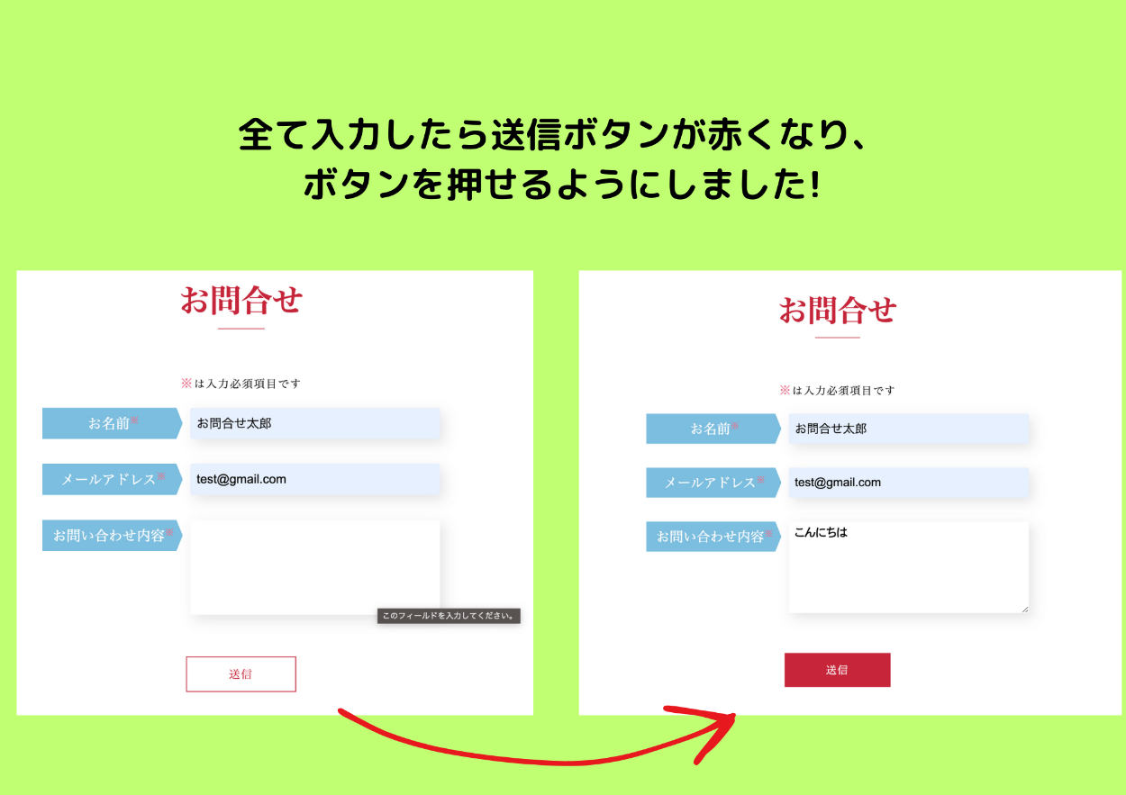 お問合せは必須欄全て入力するまでボタンを押せないようすることで誤送信を抑制しました。