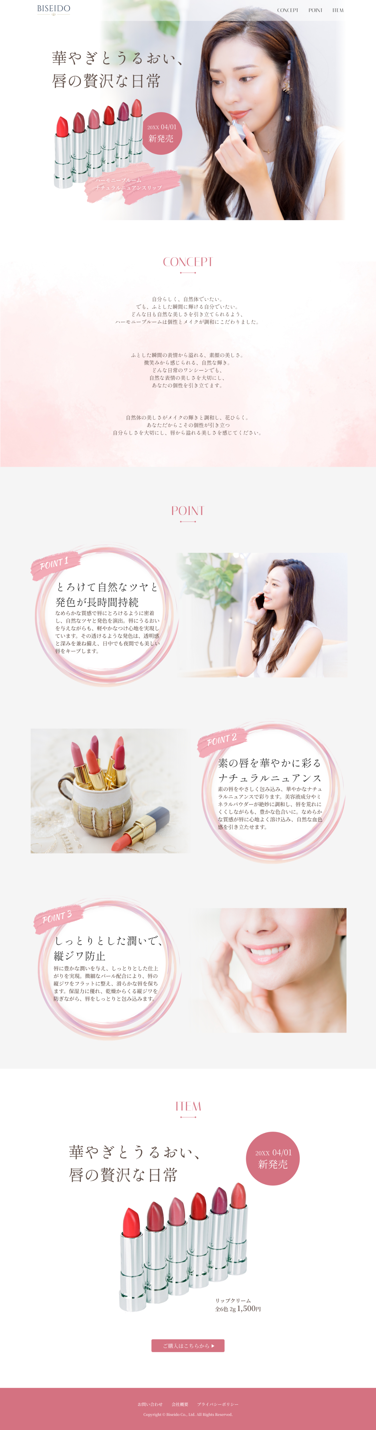 デザインカンプ制作:架空リップクリームLP ちゃんま Webデザイナー OVERVIEW Webデザインスクール「HerTech」の課題で作成した架空LPのデザインカンプです。 使用ツール:Figma制作時間:1日