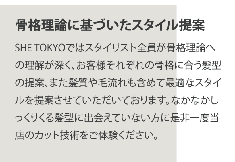 銀座にある美容室のイメージもありつつSHETokyoらしさも表現することで、競合他社との差別化をはかりました。
