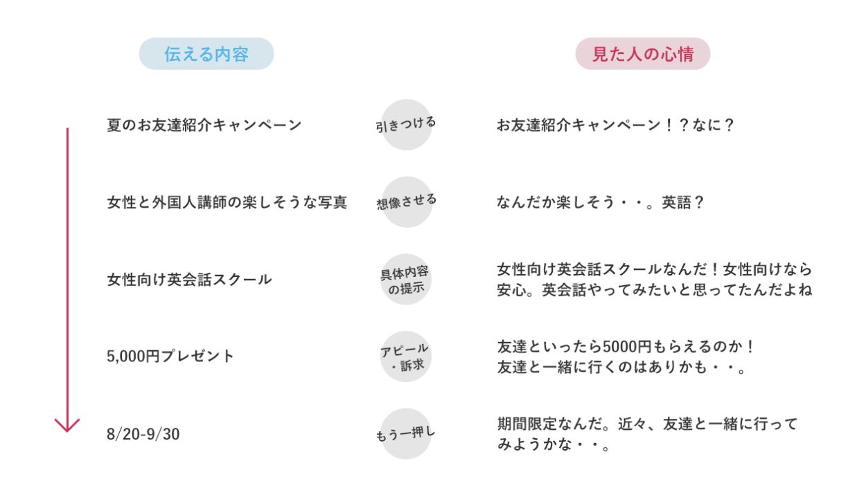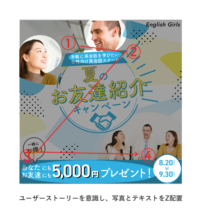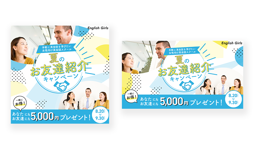 一番伝えたいキャンペーン情報を真ん中に配置し、真っ先に目線がいくようにしました。左上に英会話教室をイメージさせる外国人講師と女性の楽しそうな写真、右下に友人と一緒に英会話を学んでいる写真を配置することでキャンペーン内容である「英会話」「お友達紹介」を表現するしています。
