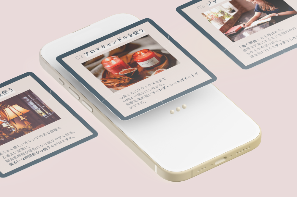 1人暮らし女性、マーケター。仕事は嫌いではないし、充実している日々をおくれている実感はあるものの、夜眠る前などに「私このままでいいのかな」と漠然とした不安が頭をよぎることがある。仕事柄Instagramをよく見る。興味があるジャンルは部屋のインテリアや料理のレシピ情報。ライフスタイルをよくする情報もおすすめに上がってきたらついつい見てしまう。趣味は好きなインテリアグッズを探すことと、ちょっといいものが置いてあるスーパーに行くこと。