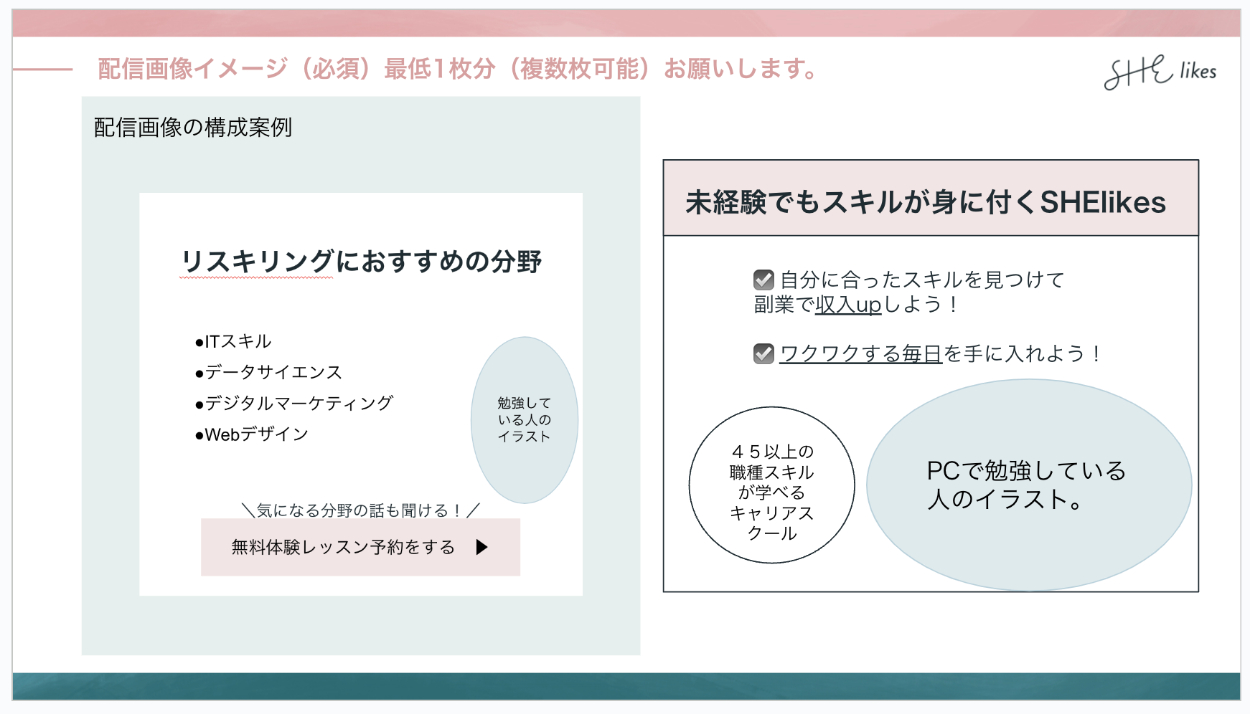 SHE株式会社の運営するSHElikesの新規顧客層に向けたLINE配信の訴求軸や内容を企画(クリエイティブ案も含む)をコンペ形式で採用していただきました。 【制作期間】4時間 【使用ツール】Googleスライド