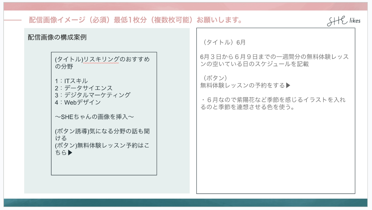 SHE SNSマーケティングコンペで採用された企画書です。本企画書を元にLINE配信される場合、クリエイティブ制作は別の方が担当されています。