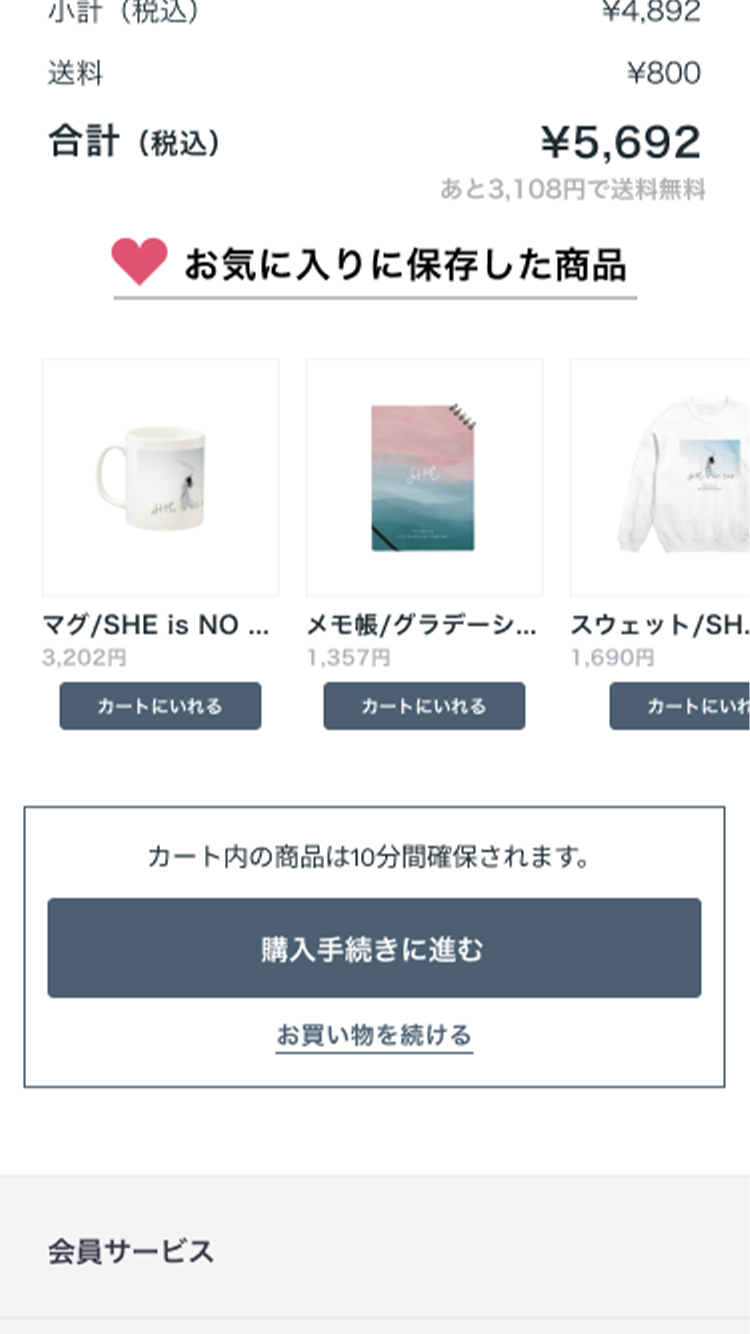カートでは上から下へのスクロールを利用して、「購入手続きに進む」ボタンの前に「お気に入りに保存した商品」を表示。「カートにいれる」ボタンも設置し、購入単価UPに繋がる工夫をしました。