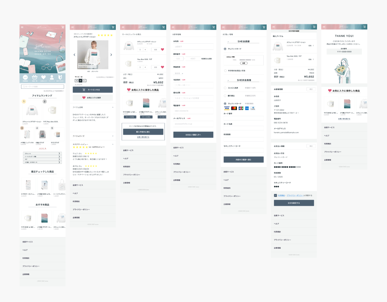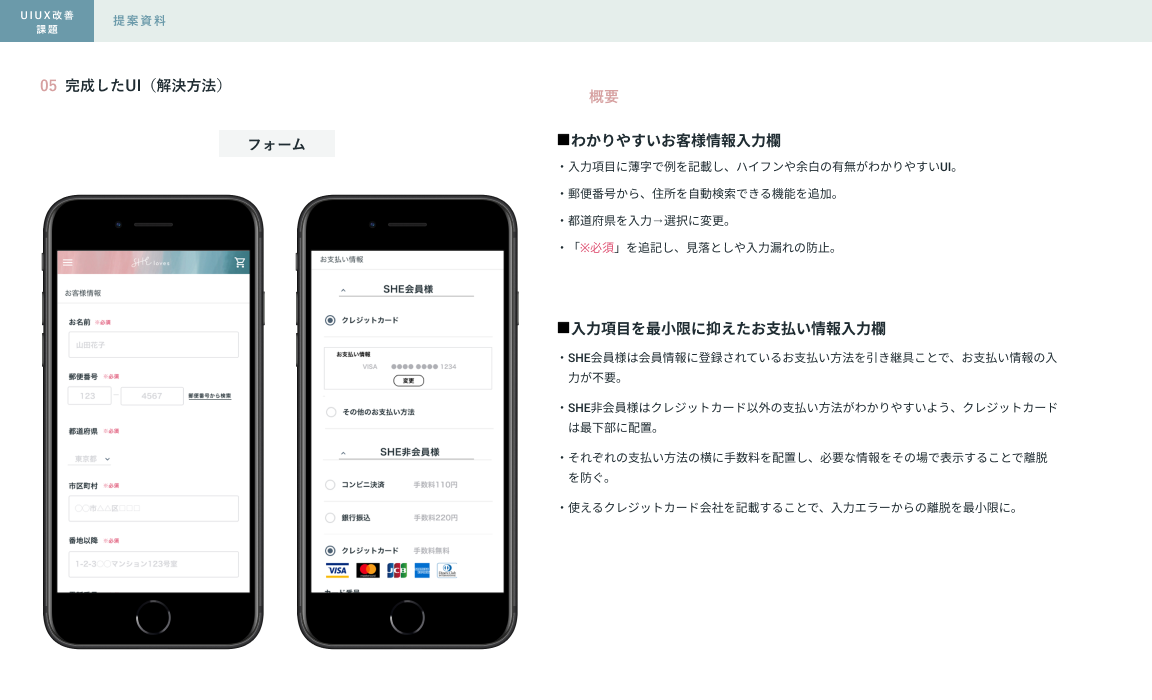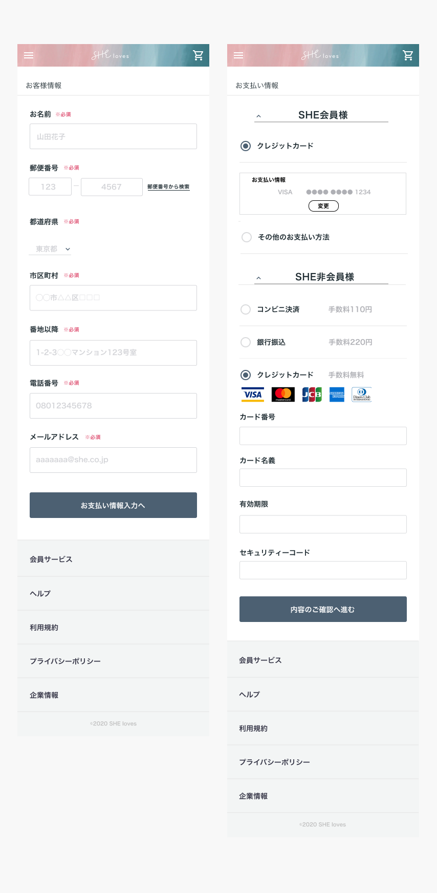 1ページの入力欄が多かったため、2ページに分けて作成しました。お客様情報入力欄は、薄字で記入例を入れることでわかりやすいUIを意識しました。お支払い情報はSHE会員様はお支払い情報を引き継げるようにし、入力の手間を省く工夫をしました。