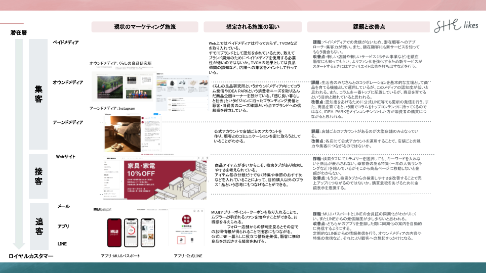 【ポイント】認知度の高い無印良品において認知度を上げるという施策は不要だと思ったので自分がCMOだったらという点で認知度が高いからこそ利用率をあげるという点をあげました。