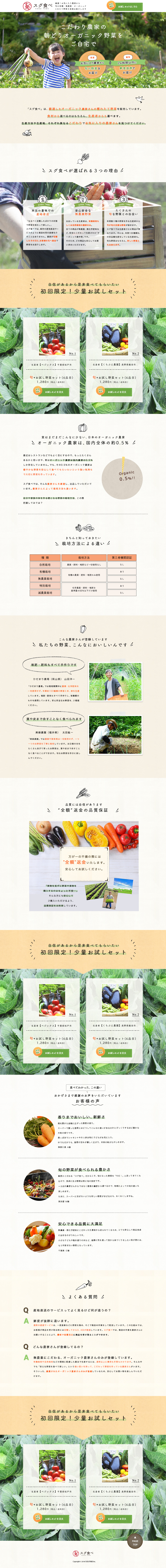 デザインはコンセプトに合っているか、ターゲットに刺さるかという2つの観点から考えました。 訴求ポイントやターゲットユーザーの好む言葉は色や下線・太字で強調、配色は清潔感のある白を基調にベージュやアースカラーを組み合わせ好感を持たれるナチュラルな雰囲気にしました。 写真は適度にカラフルなもので明るい印象に。ファーストビューの子どもの笑顔で目を惹き、農家の方の姿で安心感を、食べ物の写真から調理をして食卓に乗せる楽しみをユーザーにイメージしてもらえるようにしました。フォントは、ロゴと雰囲気が合うもので、ナチュラルかつターゲットユーザーに馴染みそうな細めゴシックにしました。 文字間や余白はたっぷり取りユーザーの好むナチュラルでゆったりとした雰囲気にしました。また素材やイラスト等のテクスチャで装飾をしたり陰影をつけたりすることで、LP らしい凝った奥行き感を出しました。
