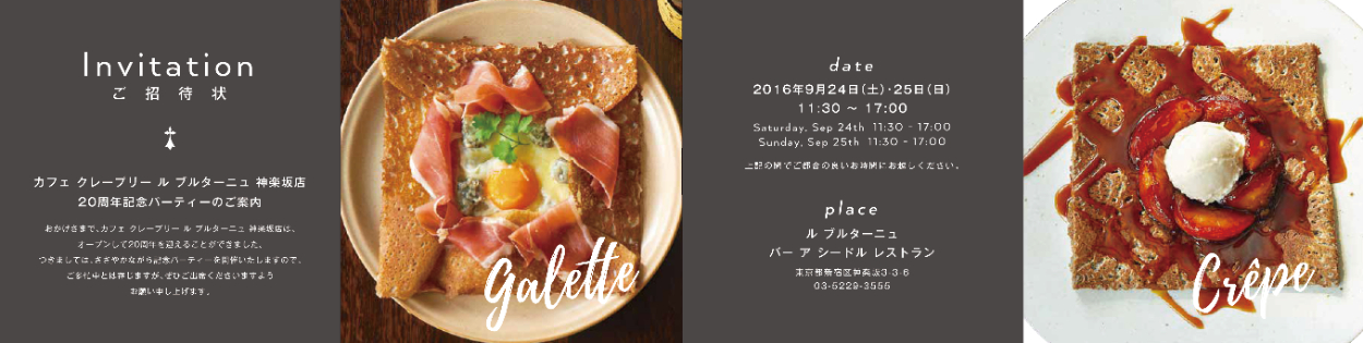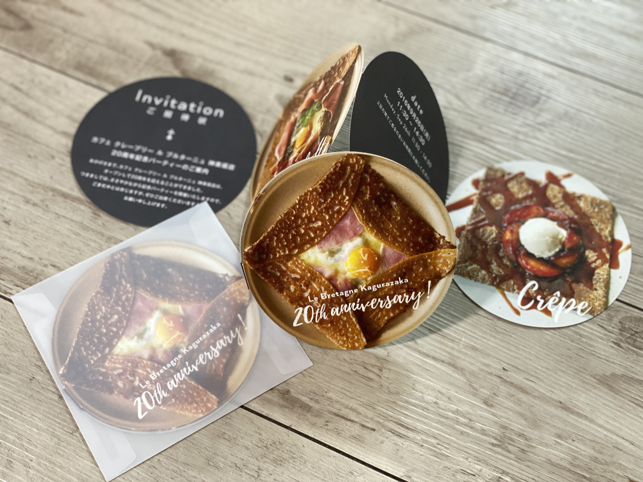 ガレットのお店なので、切り抜いて全面的にメニューをわかりやすく。20周年を記念したパーティーなので華やかにしつつも、会場であるバーの雰囲気をこわさないデザインにしました。