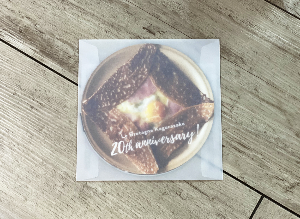 型抜きで丸型、蛇腹折り。こちらを半透明・正方形のトレーシングペーパーの封筒に入れて郵送しました。ガレットの丸さが活かされたデザインになりました。