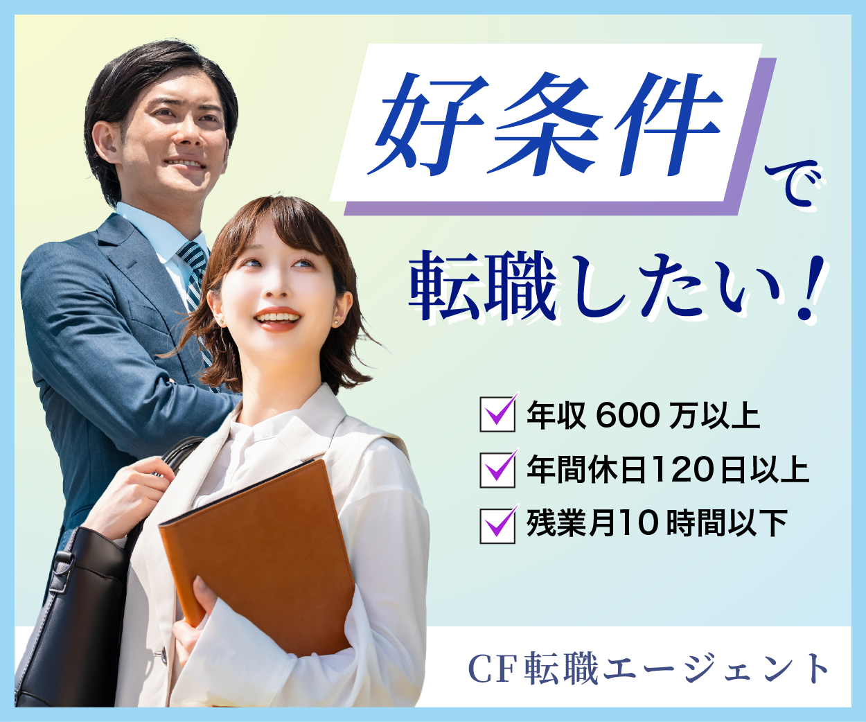 転職サイト/バナー かがみ まゆこ デザイナー/イラストレーター 自主制作目的:転職エージェントへの誘導ターゲット:今の会社や待遇に不満があり、 転職を考えている人デザインの印象:爽やかにしたい 女性・男性ともに訴求できるように