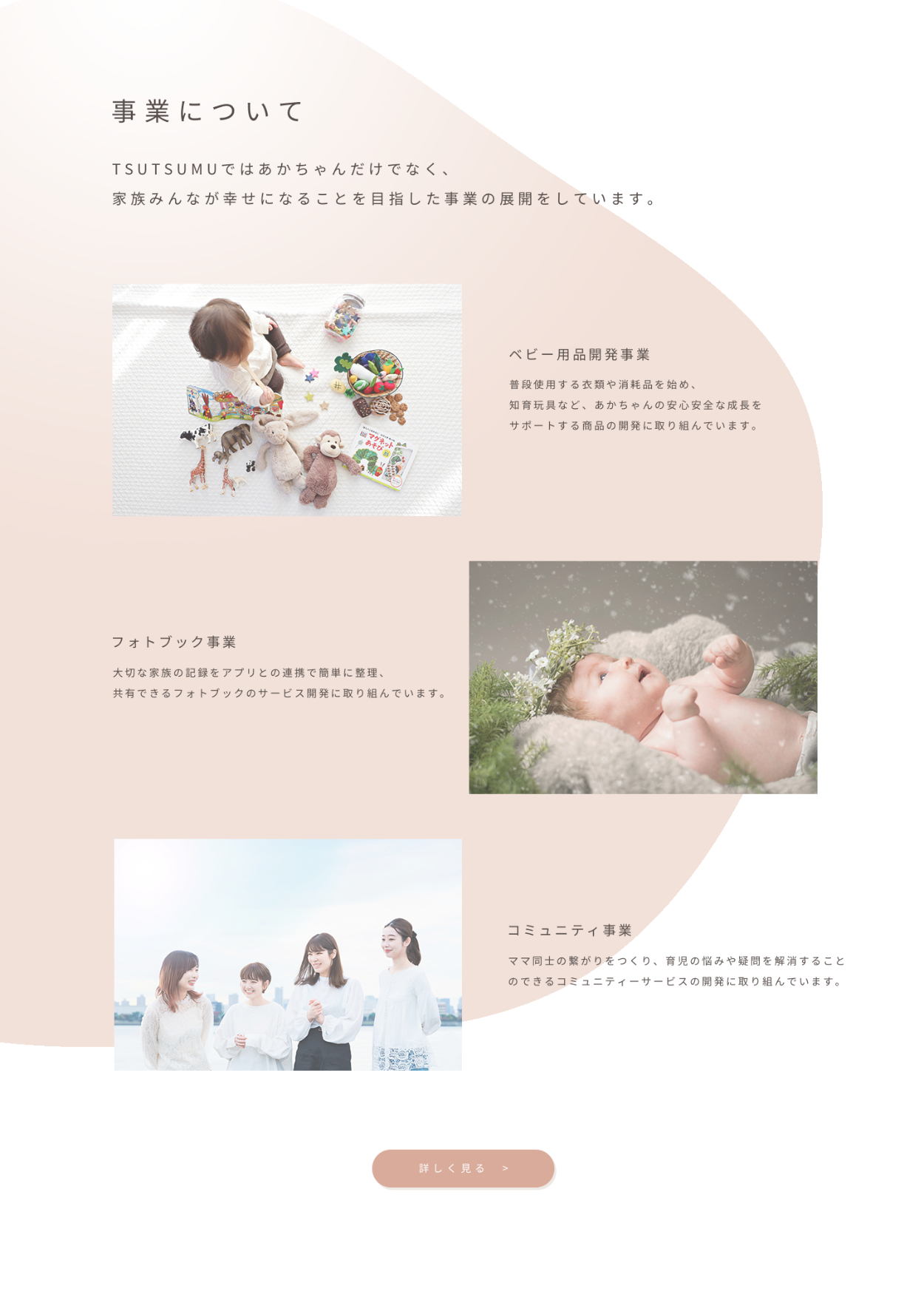 ベビー用品をメインとし、ママの育児をサポートするコミュニティ事業や家族みんなが幸せになるフォトブック事業などを展開。軸はベビー用品だが、今後ママ・パパ、家族向けのサービスも展開する予定。
