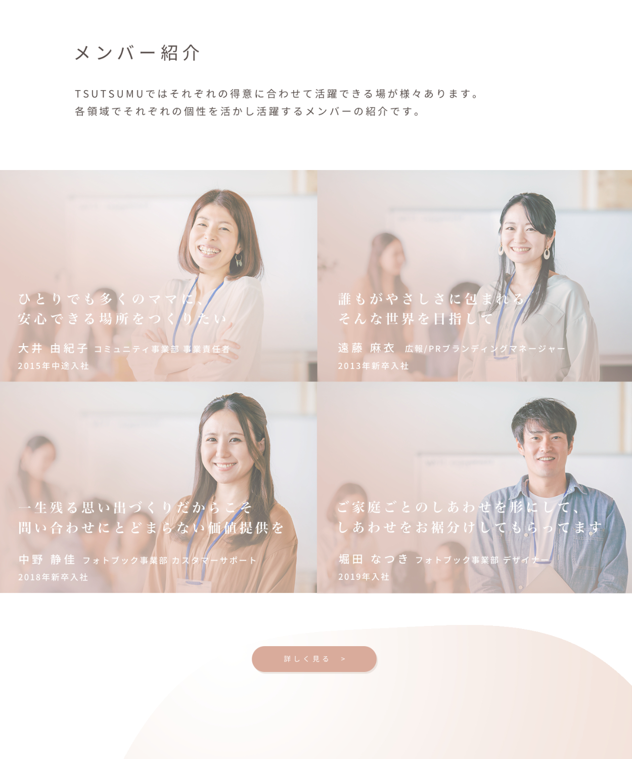 メンバーの写真+ポジションだけではなく、事業に携わる想いを一文入れることで、どんな理念を持っている人たちが働いているのか臨場感を持って知る。