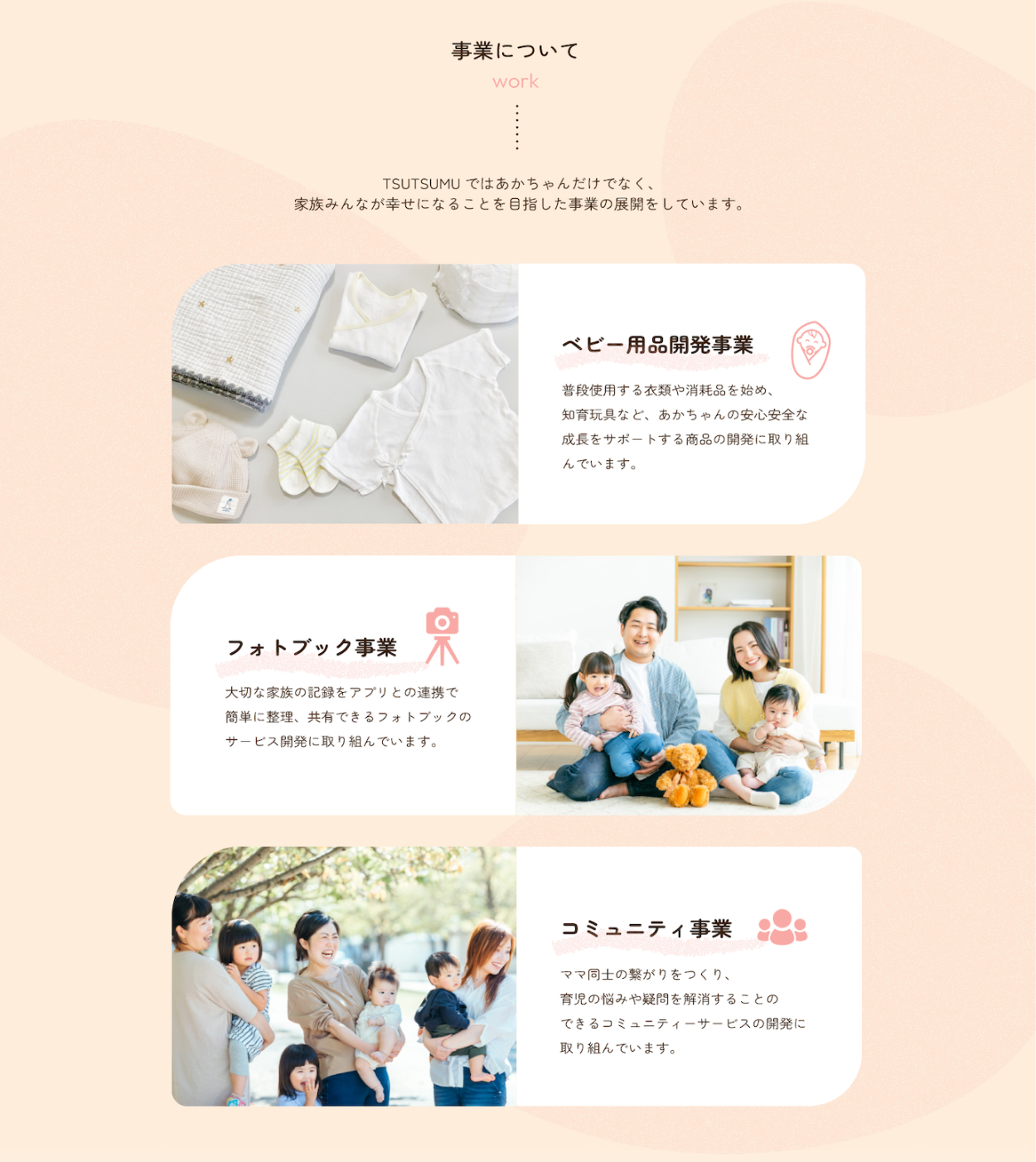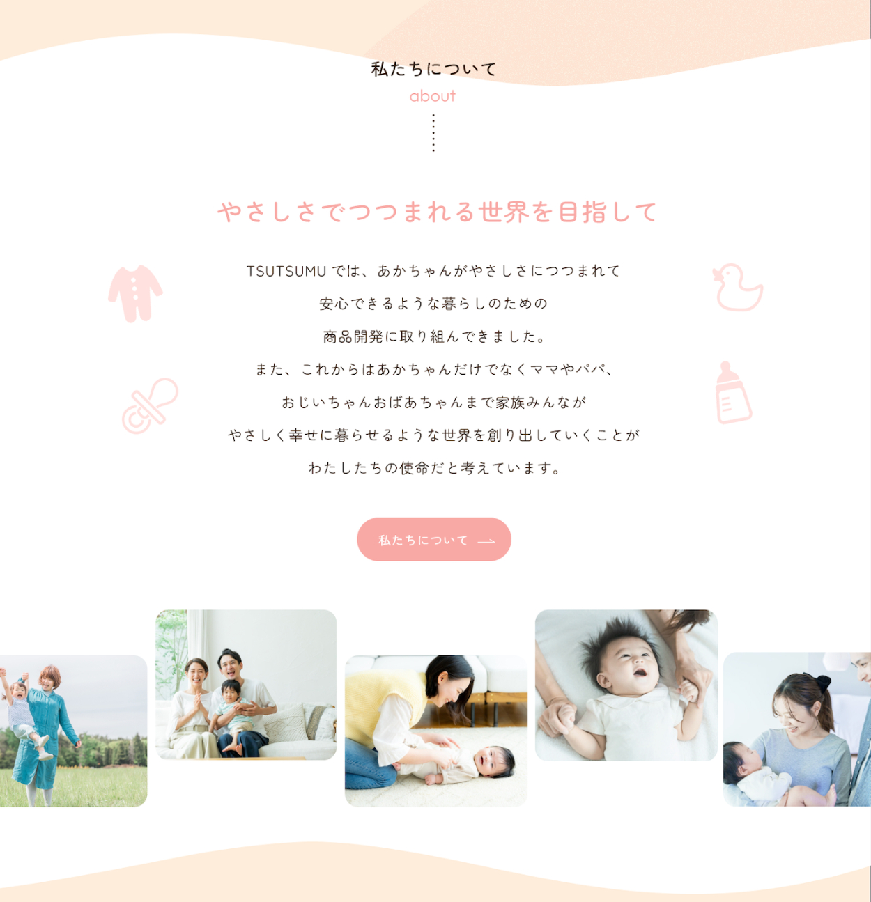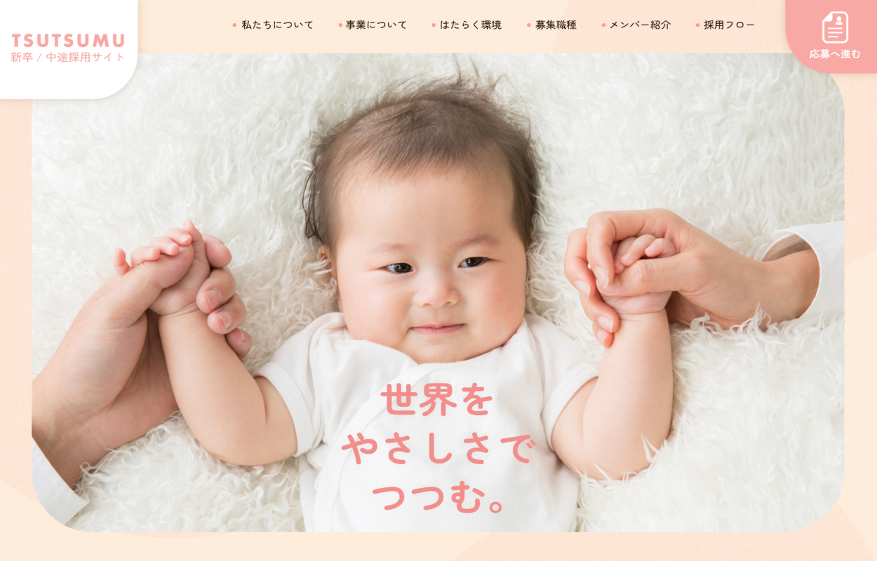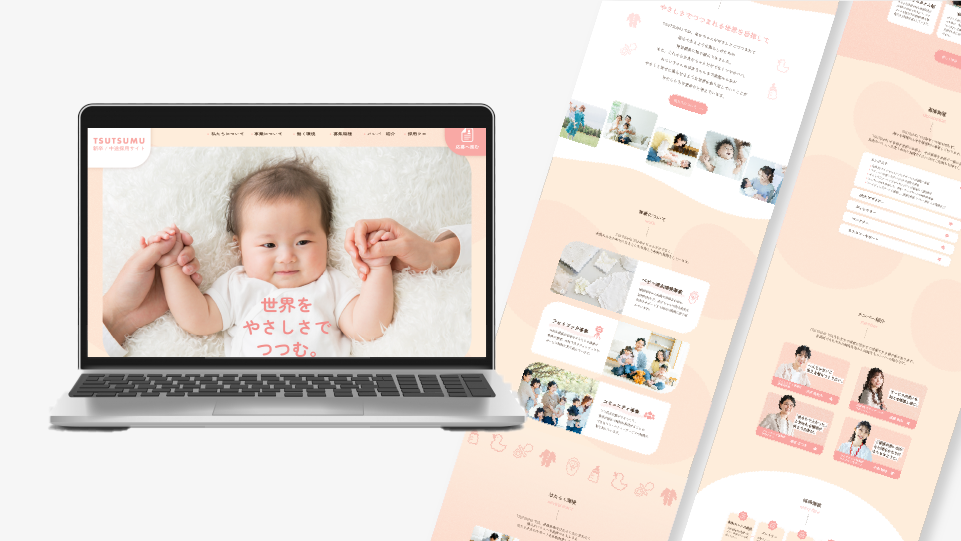 ・TSUTSUMUというクライアント名に合うように、赤ちゃんの手を両側から保護者が包んでいる写真を選定しました。