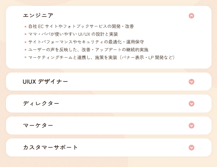・アコーディオンメニューを実装し、気になる職種の応募内容をクリックして確認できるようにしました。