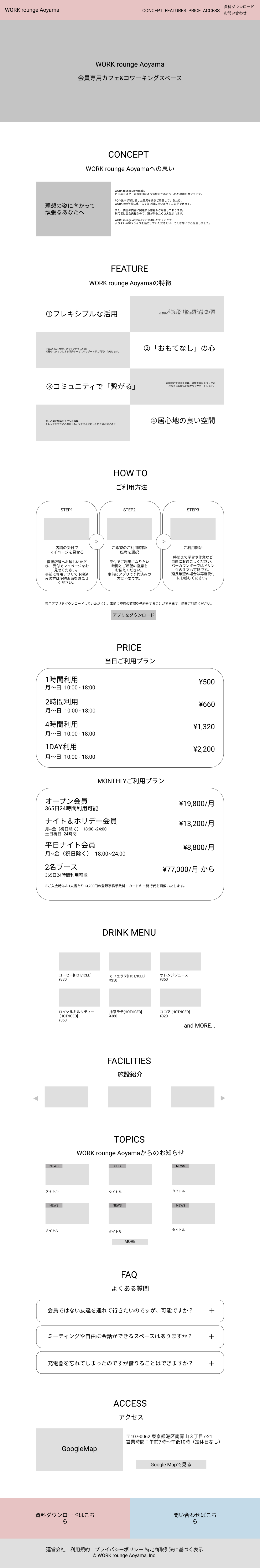 目的:会員様限定のカフェ&コワーキングスペースをオープンすることになり、利用方法やアクセス情報を載せたWeb サイトを制作したい。/ WORK rounge Aoyama について知ってもらいたい。