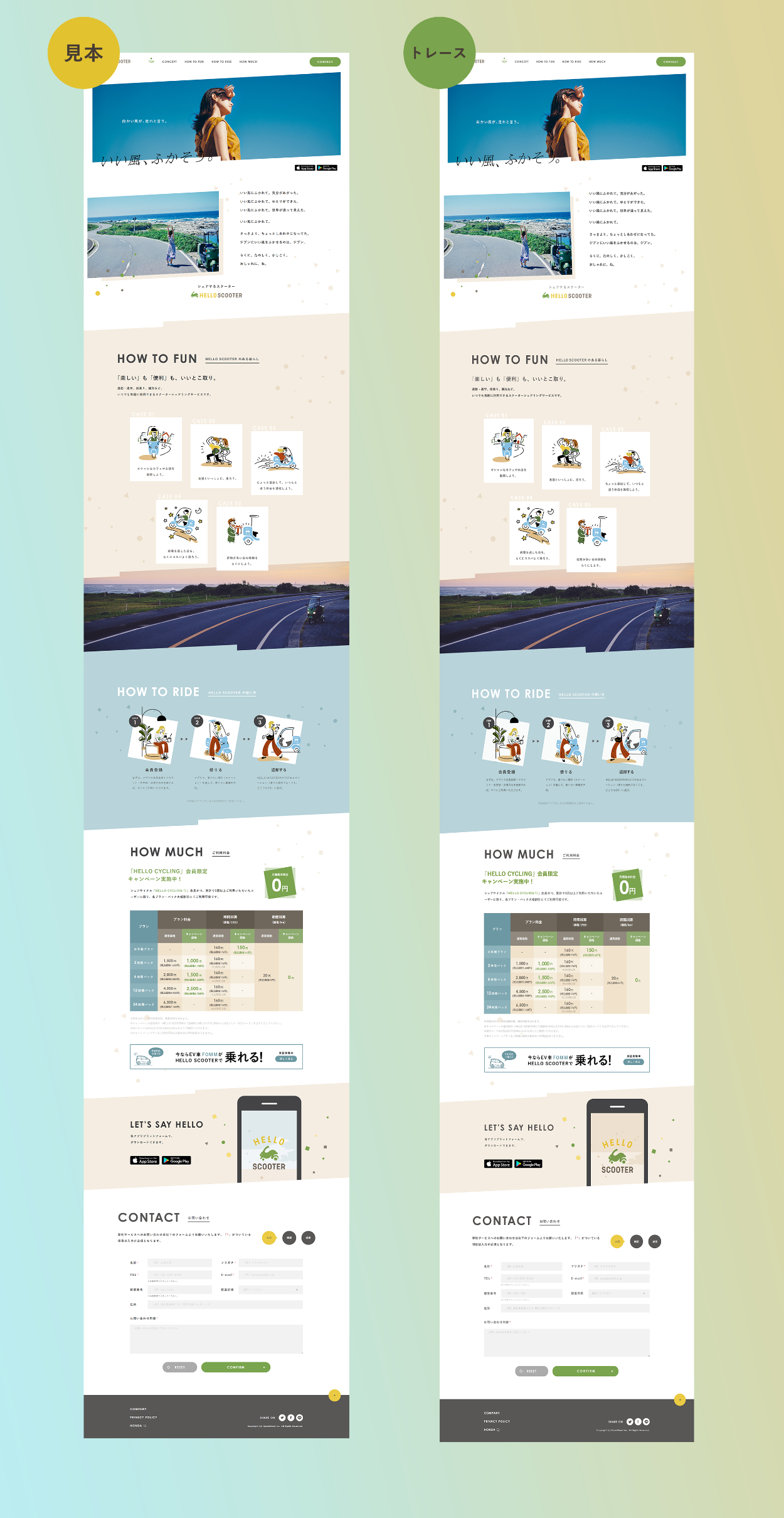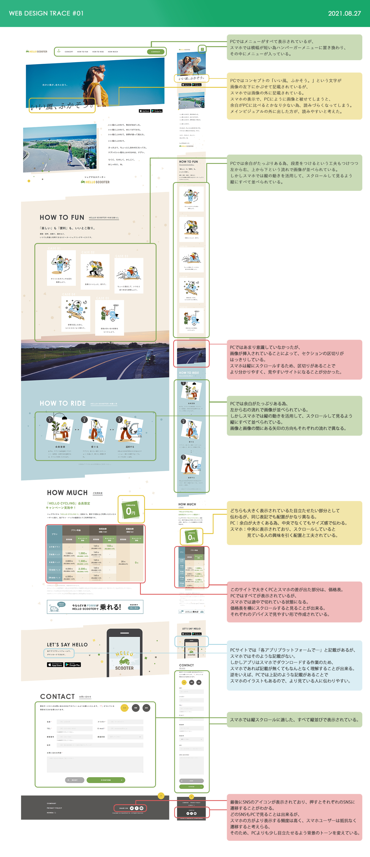 SHElikes MULTI CREATOR PROJECTの課題で、LPトレースに取組みました。「HELLO SCOOTER」さんのLPをトレースし、デザインガイドラインを制作し、PCとスマホのデザインを比較・分析してまとめました。(制作時間:32時間)