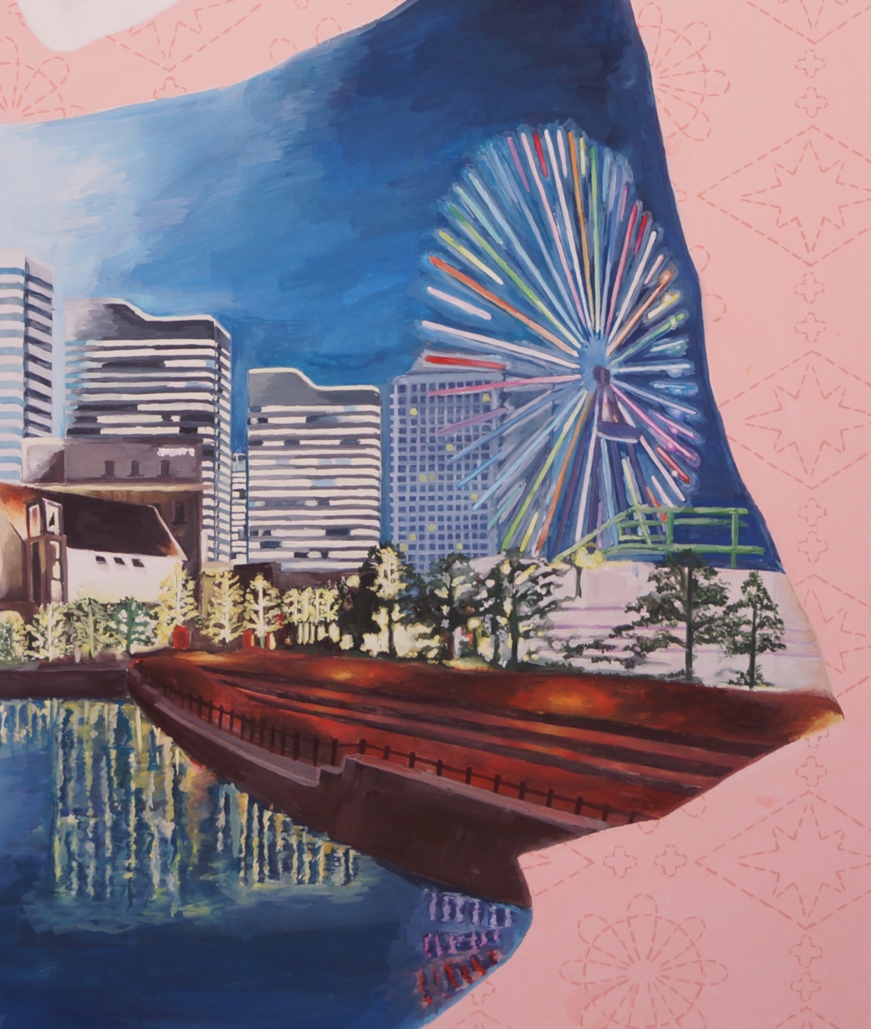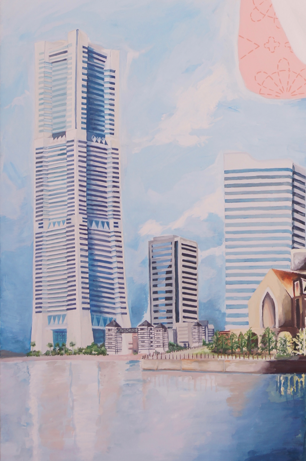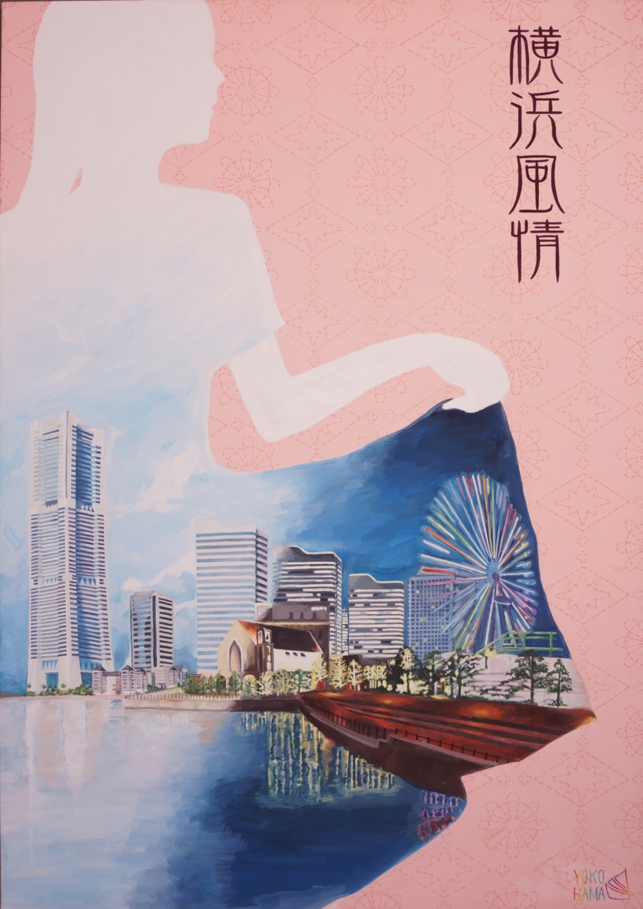 女性らしいピンクの背景に女性のシルエット、そのシルエットのスカートの部分の中に横浜の風景が滲んでいるようなイメージで描きました。ビルの均等さと、夜のライトの光を不自然なく輝かせるように描きました。