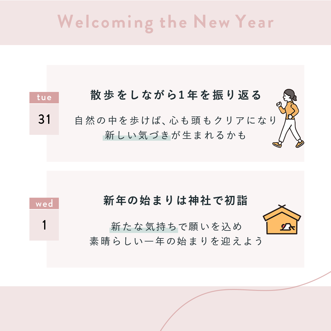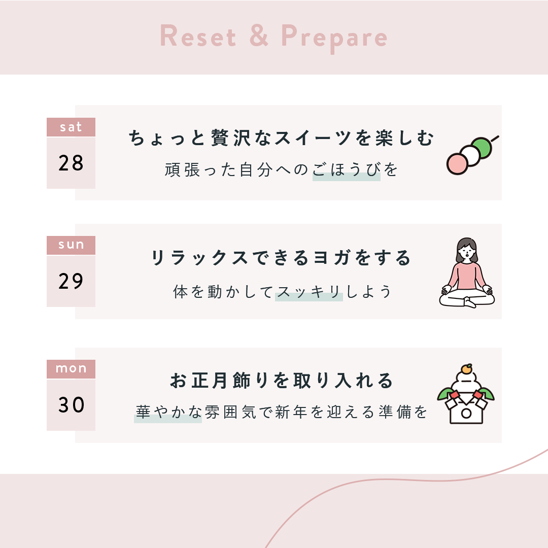 タイトルの配置: タイトルは中央上部に配置し、読みやすい大きめのフォントを使用して視線を引くよう工夫しました。28~30/31~1/2~3と年末年始を3つに分けてそれぞれテーマを持たせた上で内容を考えました。