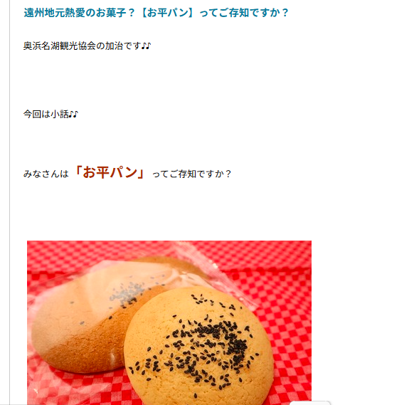 観光協会の職員として従事していた際に、ブログ等で地元の文化やイベント、歴史について取材、発信していました。今回の記事の「お平パン」は観光協会の仕事をしていく中で気が付いた地元の独自の珍しい文化について、カジュアルな文体で執筆しました。