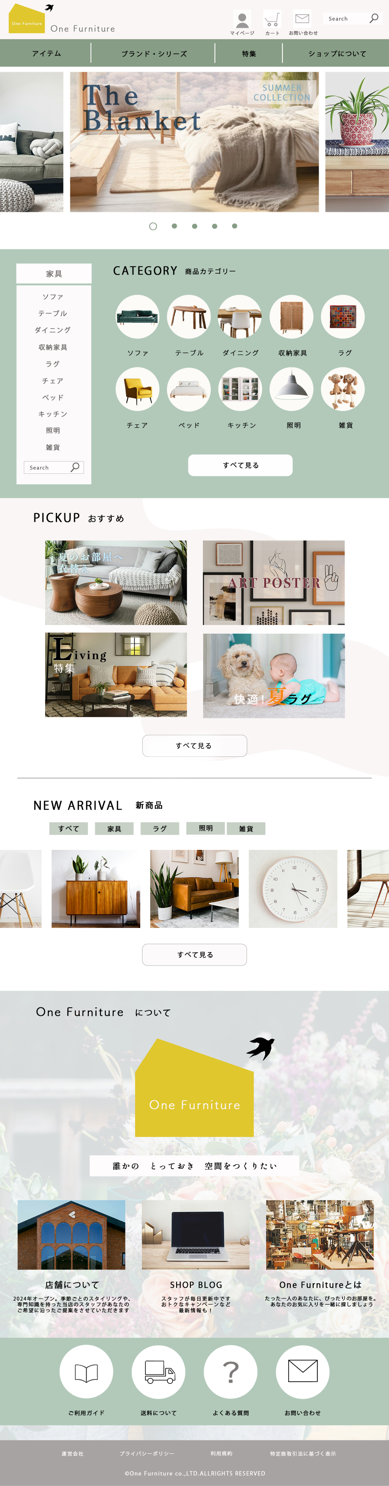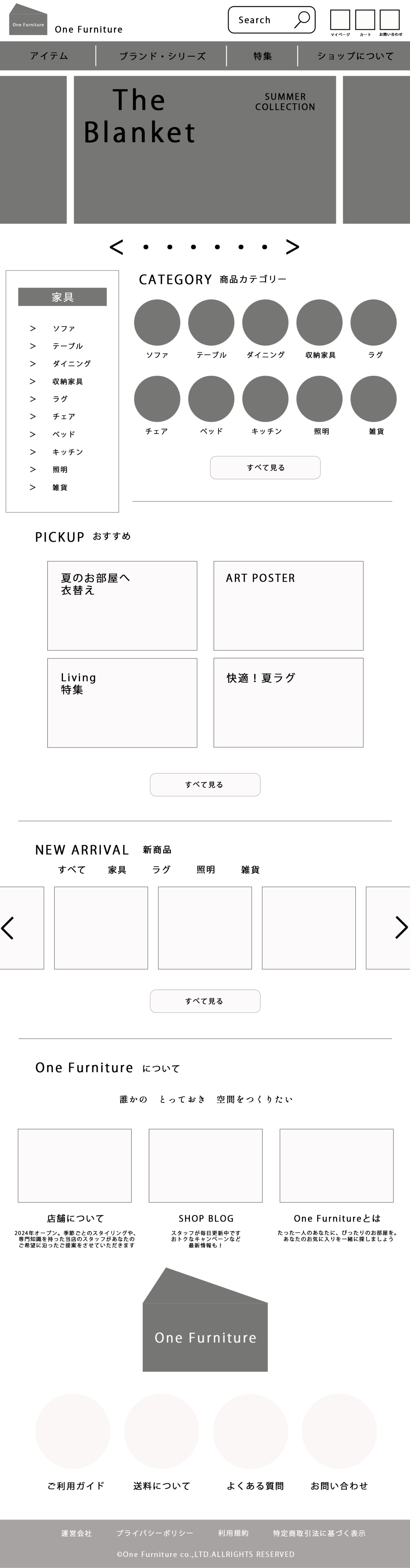 架空クライアントからの要件書をもとに、ワイヤーフレームを作成、インテリアショップのECサイトデザイン(PC版)を作成しました。
