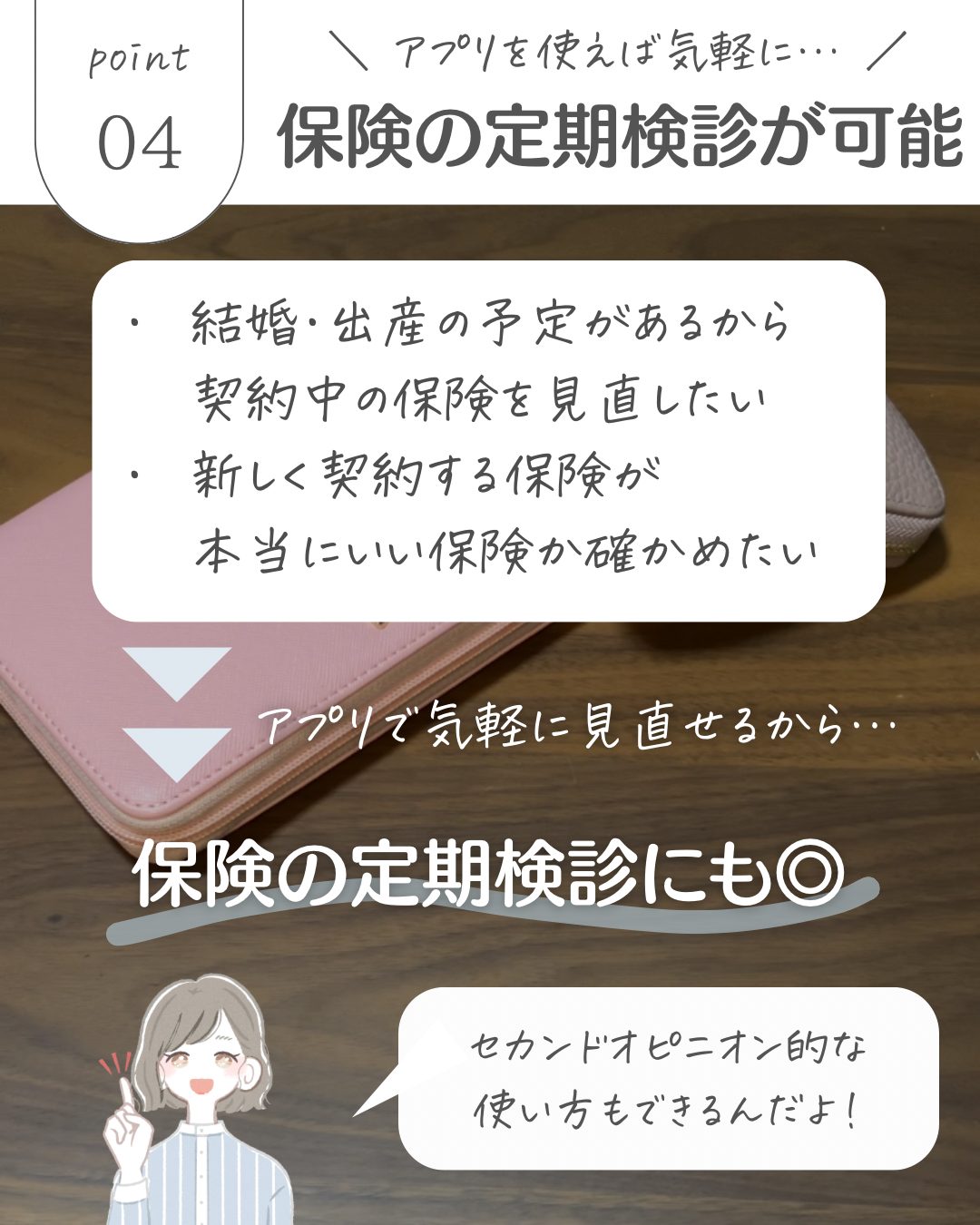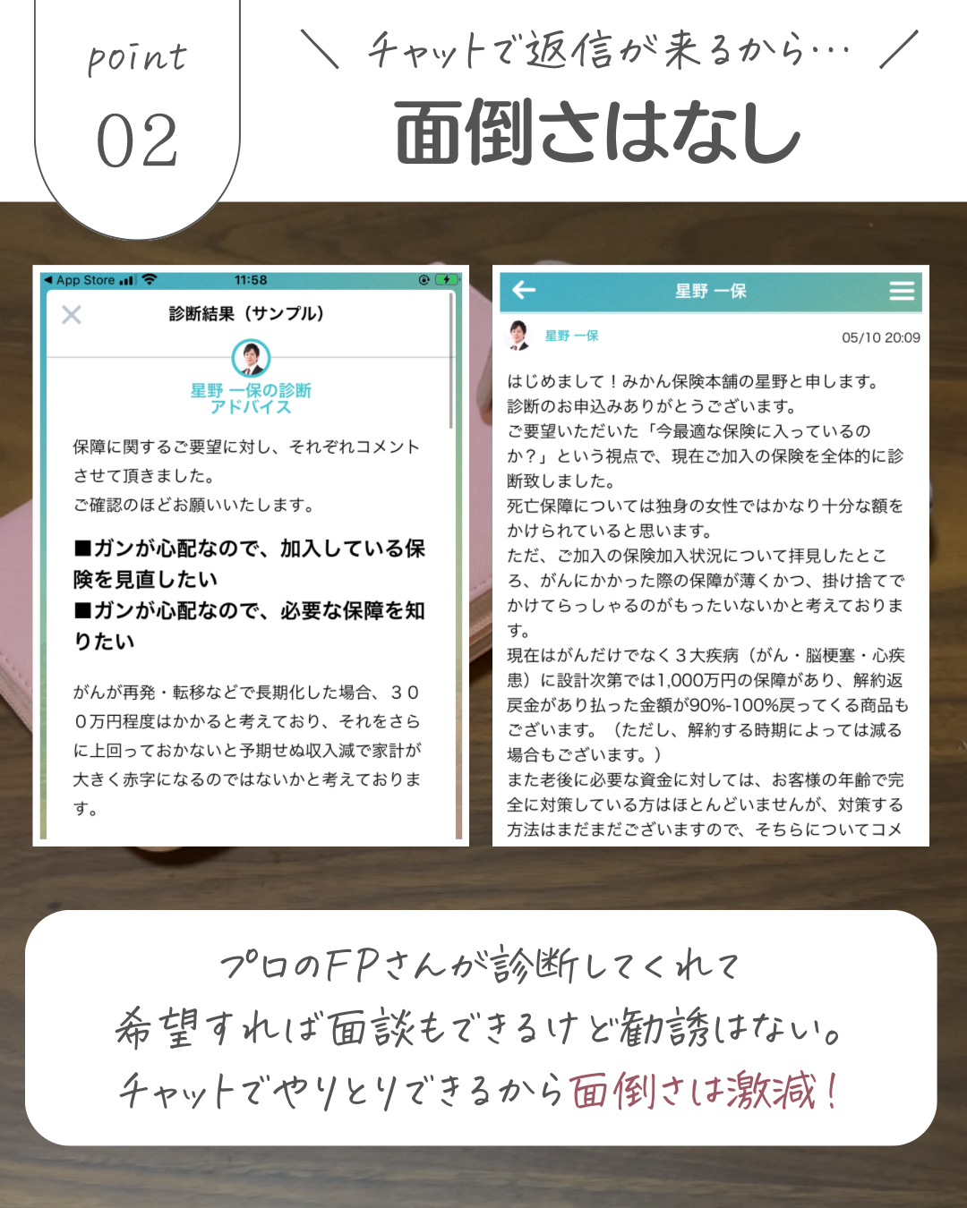 写真で保険証券の写真を撮ってアプリで送信すると、アプリのチャットにプロのFPから返信が来るという仕組みになっているアプリになります。