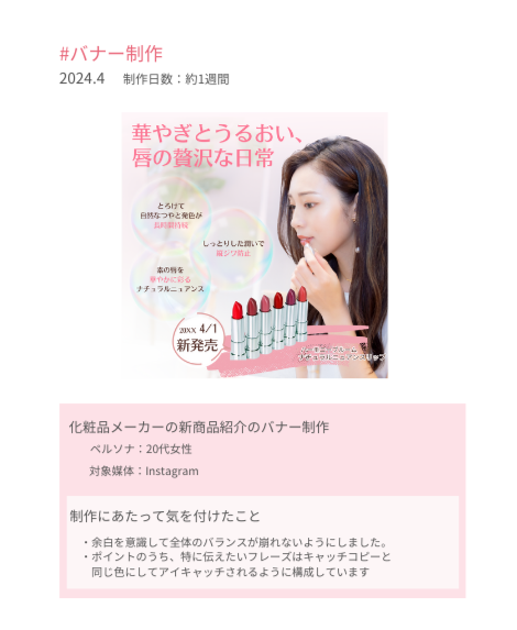 〔課題〕バナー制作 sako_designer Webデザイナー OVERVIEW Hertechの課題で、架空のクライアントからの依頼内容をもとにバナー制作に取り組みました。 YEAR 2024 制作したバナー