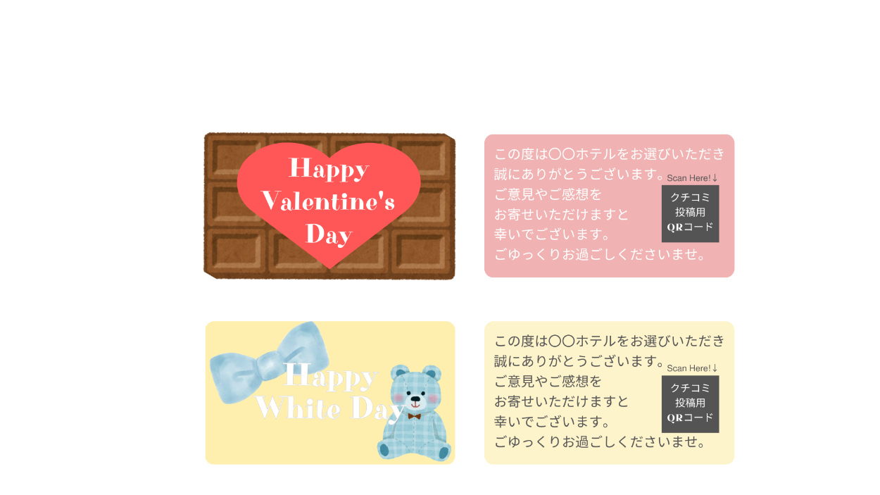 【自主制作】ホテルのクチコミ用紙 え り Webデザイナー OVERVIEW 実際にホテルで配布したクチコミ用紙です。 (自分のPCで作成し直したため多少見た目は異なっています。) YEAR 2025 バレンタイン、ホワイトデーでお客様にお菓子をお渡しする機会がありました。その際、お菓子に添えるメッセージカードを作成しました♪裏面にはクチコミ投稿用QRコードを載せ、クチコミ数アップを目指しました。