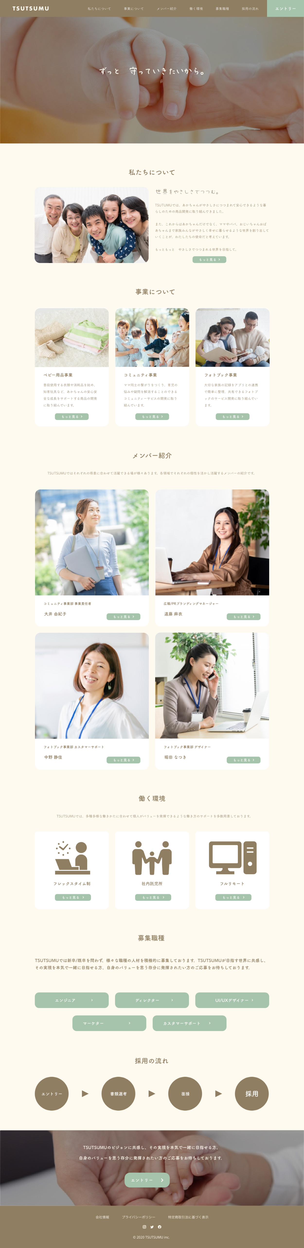 ◆概要:ベビー用品をメイン事業とした「TSUTSUMU株式会社」の採用サイト ◆目的:カルチャーフィットする方にエントリーしてもらう。 ◆ターゲット: 報酬面よりもTSUTSUMUの世界に強く共感してくださる方。