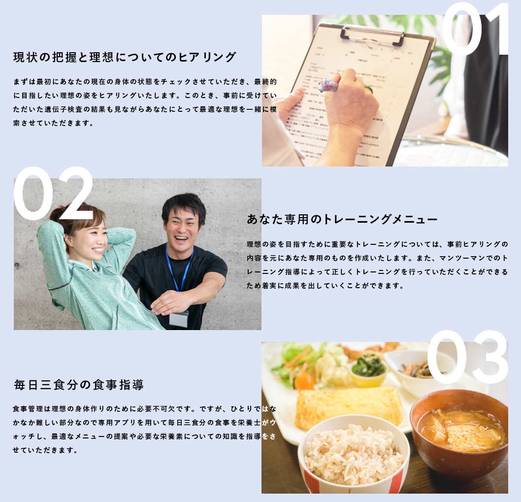 2.30代の女性をメインターゲットとしている女性専用のパーソナルジム。ただ痩せるのではなく、自分らしい美しさを目指すことを大切にしており、どのような姿を目指していくかの目標設定から寄り添い、トレーニングはもちろん日々の食事管理までを徹底してサポートしてくれるのが特徴。