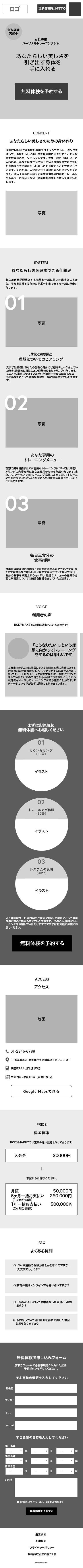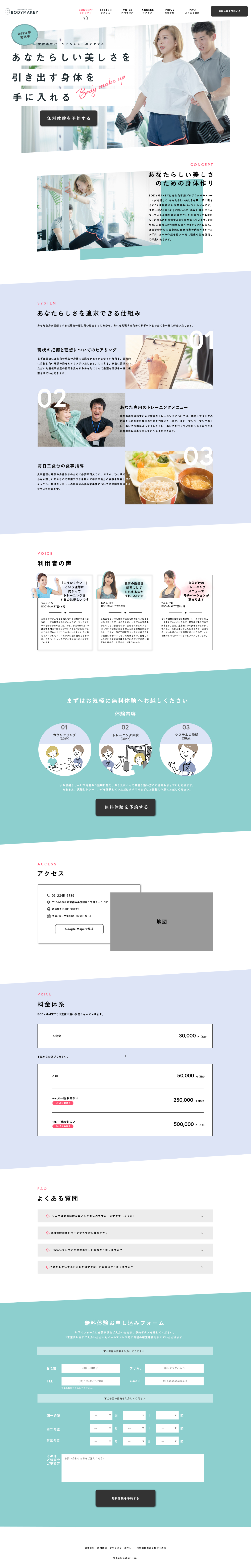SHElikes MULTI CREATOR PROJECTの課題。女性専用パーソナルジムのLP制作に取り組みました。クライアントからの要件書とワイヤーフレームを元に、PCのデザインカンプとSPのワイヤーフレームを制作しました。(制作時間:42時間)