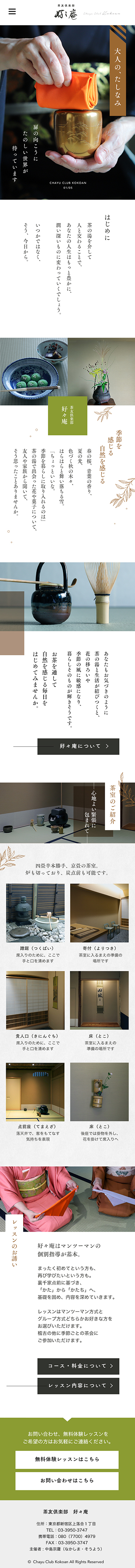 WEBサイト新規立ち上げ HANAKO T フリーランスWebデザイナー OVERVIEW 茶友倶楽部 好々庵 ウェブサイトデザイン制作 YEAR 2019 お茶のお教室のページ。撮影からデザインまでを担当。スマートフォンファーストで、縦書きの大人の世界観のあるサイトに仕上げたいという先生からのオーダーをいただきました。貴重なものが多いお教室なので、目にも楽しく心が豊かになる空間でした。https://www.kokoan.net/ WEBSITE