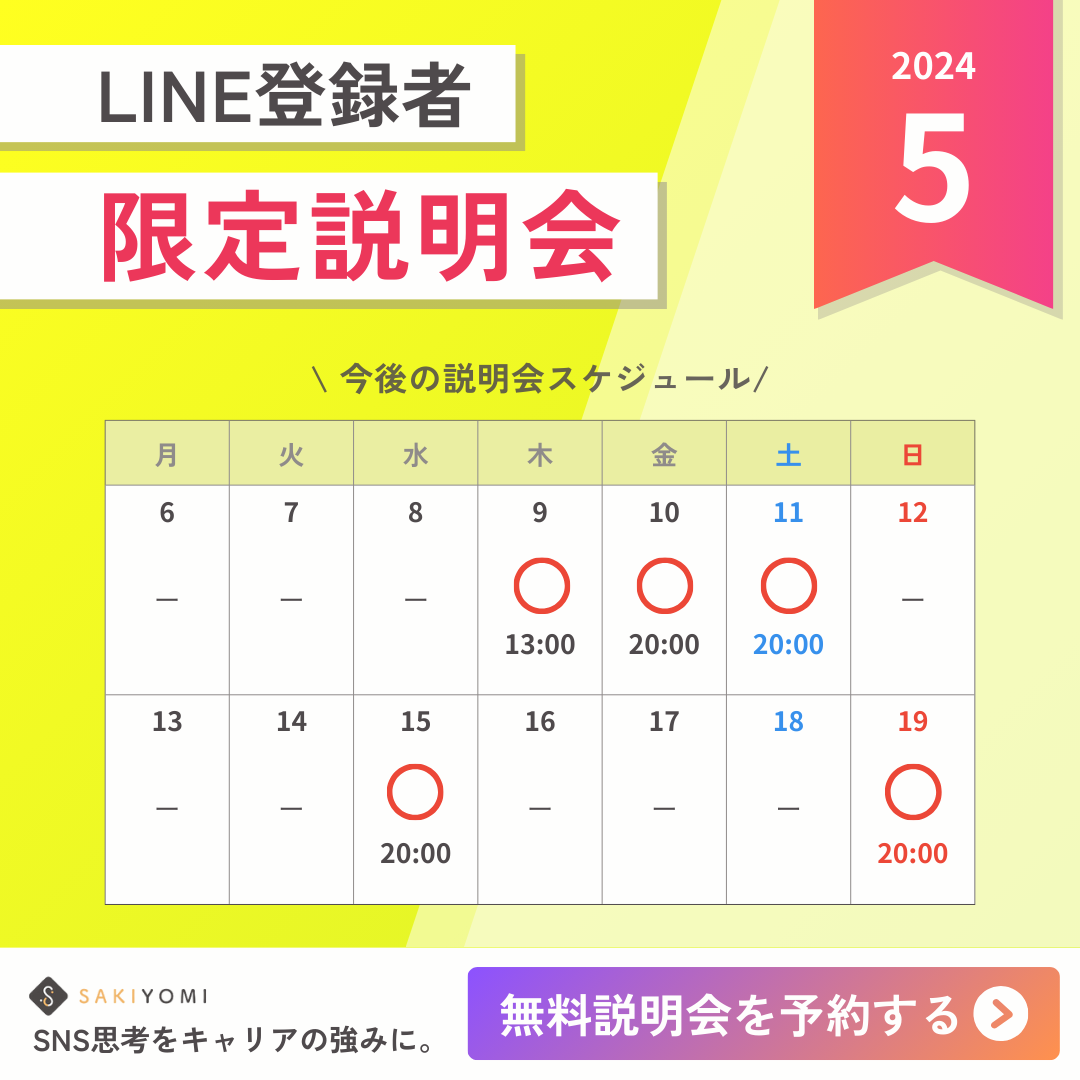 【株式会社SAKIYOMI様】公式LINEバナー maki.m デザイナー / アートディレクター / イラストレーター OVERVIEW 「SAKIYOMIスクール」LINE公式アカウントのバナーを制作いたしました。[制作時間:2時間 / 制作期間:1日間 / 使用ツール:Canva] YEAR 2024 ▼要件目的:説明会の集客2週間のスケジュールが見通せるように「予約する」というボタンを入れる WEBSITE