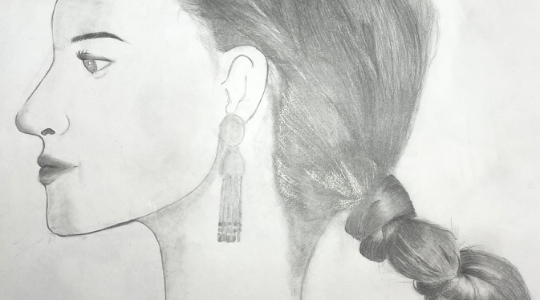 斜め横から見た顔の書き方を教えてもらって、ヘアスタイルと影をつけました。