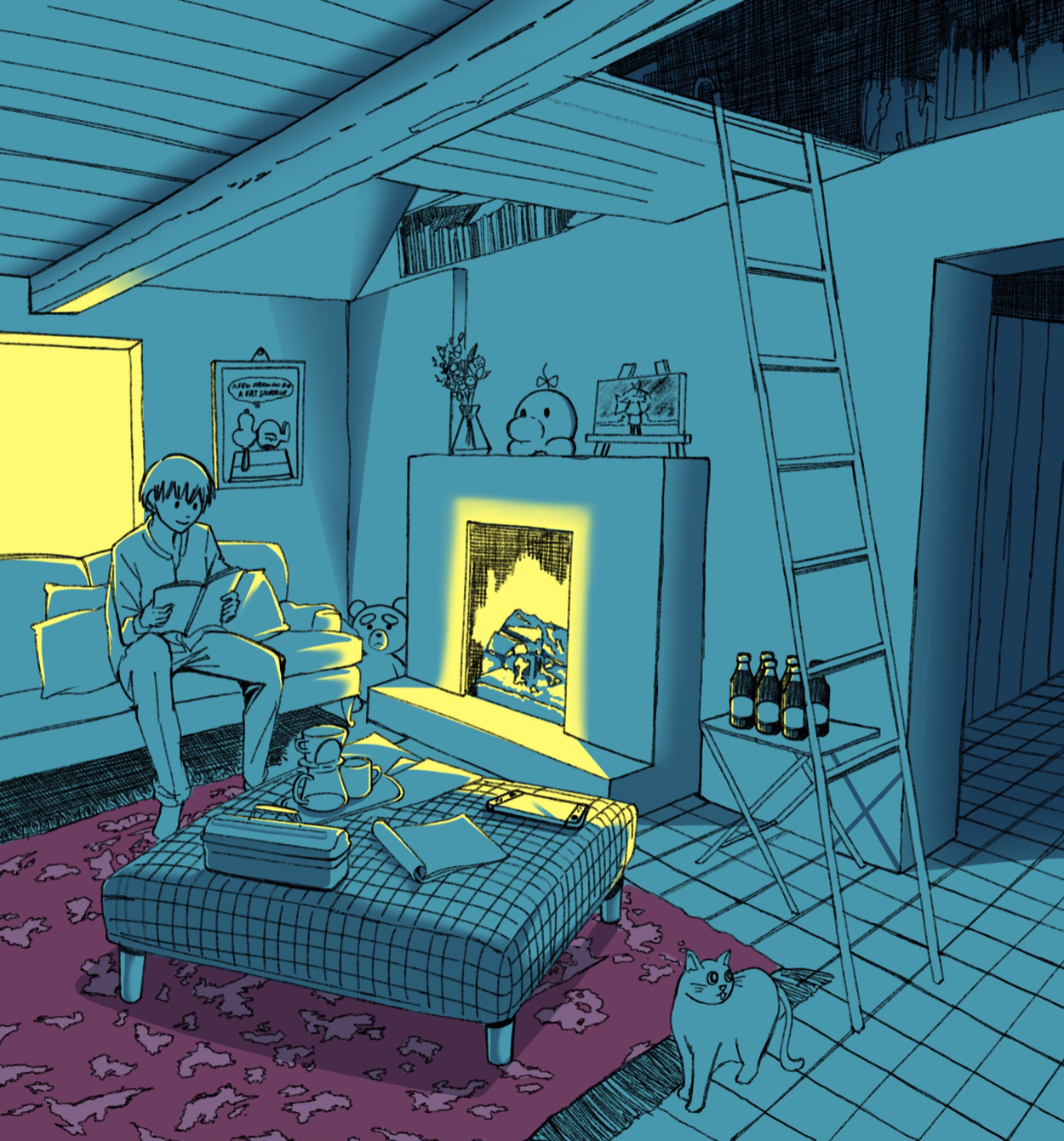 「Afternoon」 Kyohei Koguchi グラフィックデザイナー OVERVIEW 趣味で制作しているイラストです。 暖炉とネコのいる暮らし、いつか実現させたいものです。 YEAR 2021