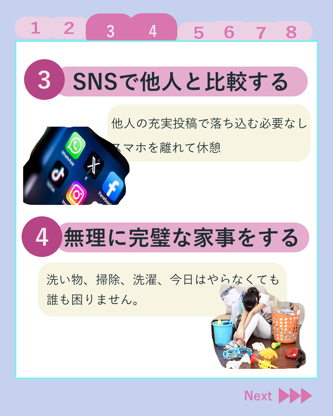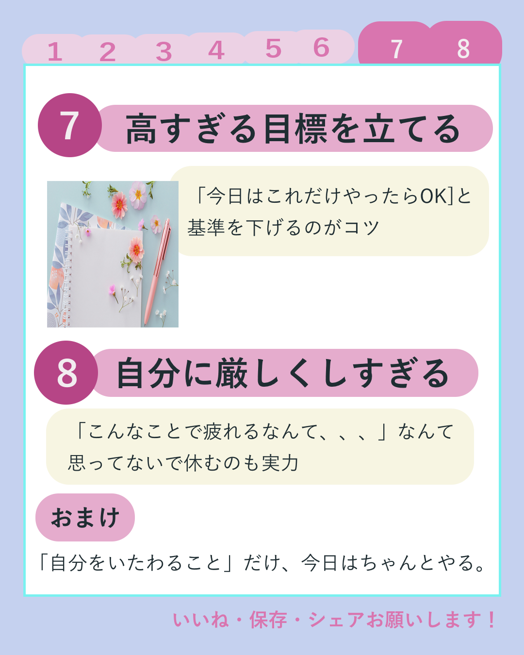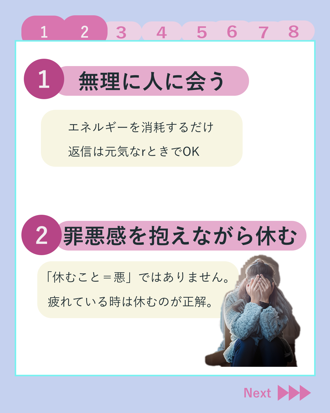 疲れた日の「やらないことリスト」8選 saya webデザイナー OVERVIEW SHE_liks AD 【工夫したところ】ノートのように見出しをもうけページの項目を目立つようにしました。数字とタイトルは○や楕円で文字が目立つようにしました。Nextの部分は余白を意識しました。Instagramのバナーということで「いいね・保存・シェアをお願いします」をいう文言を加えました。