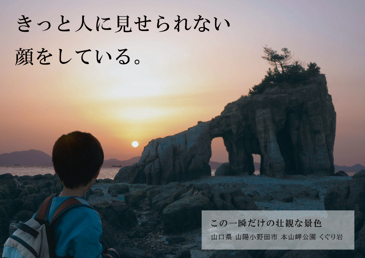 「やまぐちの元気」がテーマということで、私の地元である山陽小野田市のくぐり岩の夕日を、ぜひ広告にしたいと考えました。正直、山陽小野田市の知名度は低く、くぐり岩の存在自体知らない人がほとんどだと思います。そこで、少しでも多くの人にくぐり岩の壮観な景色をみてほしいと考えました。