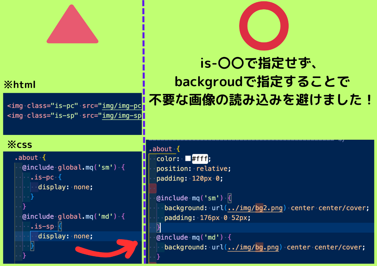 - 不要な画像の読み込みを避けるために画像の切り替えはdisplay:none;ではなく、背景画像で行いました!