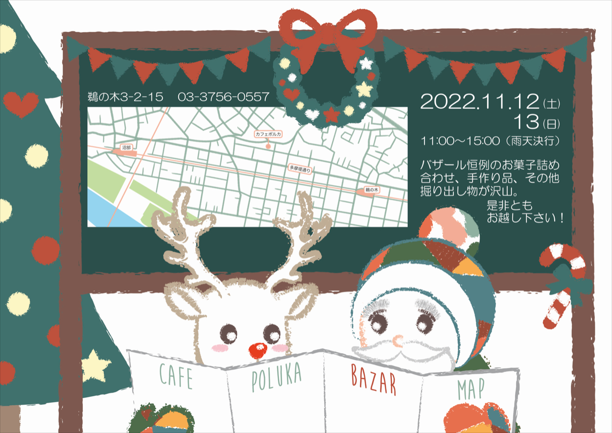 まだコロナ禍だったとはいえ、通常規模のバザールを開催した際に制作したフライヤーになります。クレヨンタッチの、クリスマスを意識したデザインにしました。