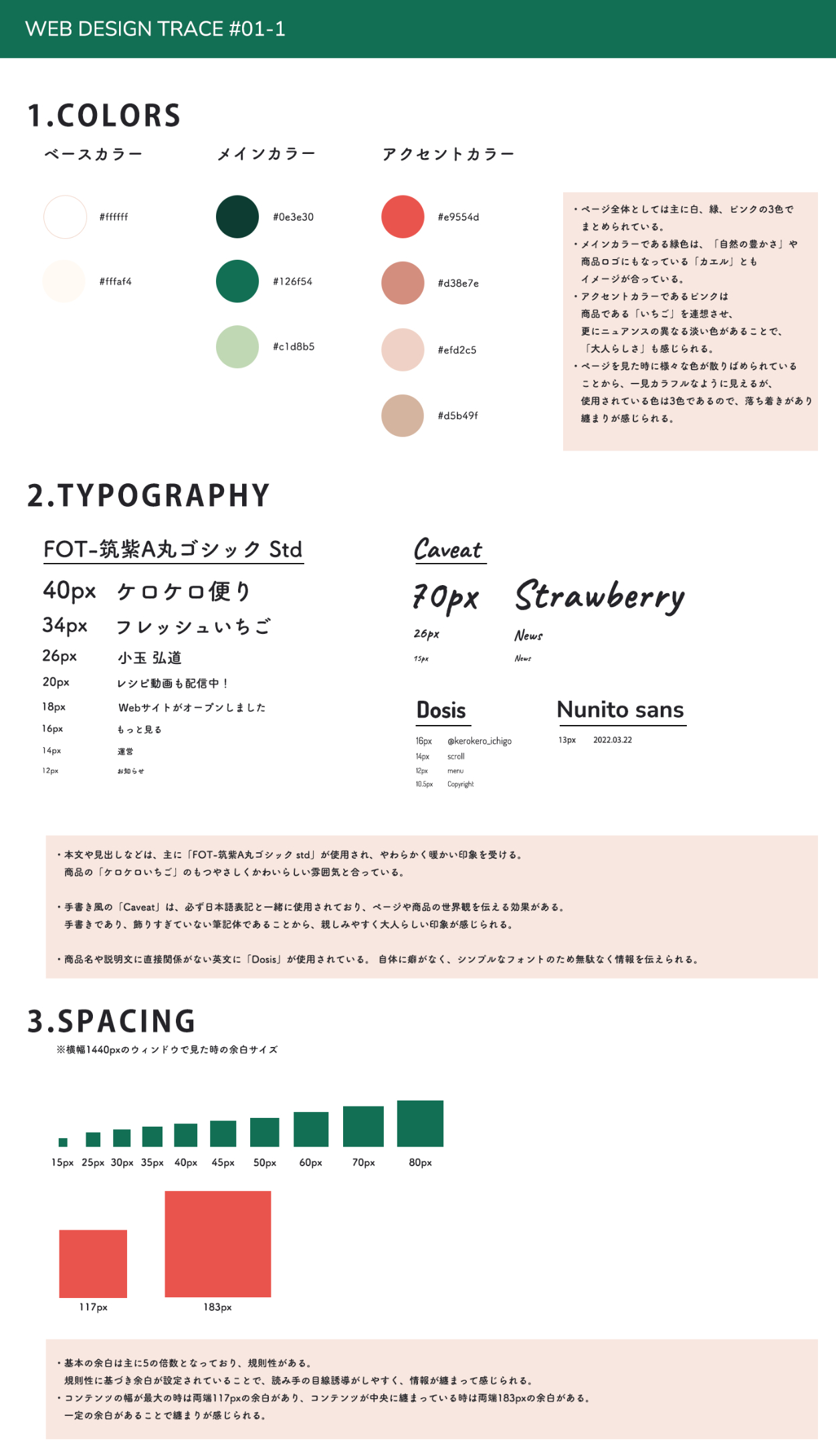 SHElikes MULTI CREATOR COURSEにて、WEBページトレース課題に取り組みました。実際にあるWebサイトのトレース、スタイルガイドの作成・PCとSPの相違分析の結果をまとめました。
