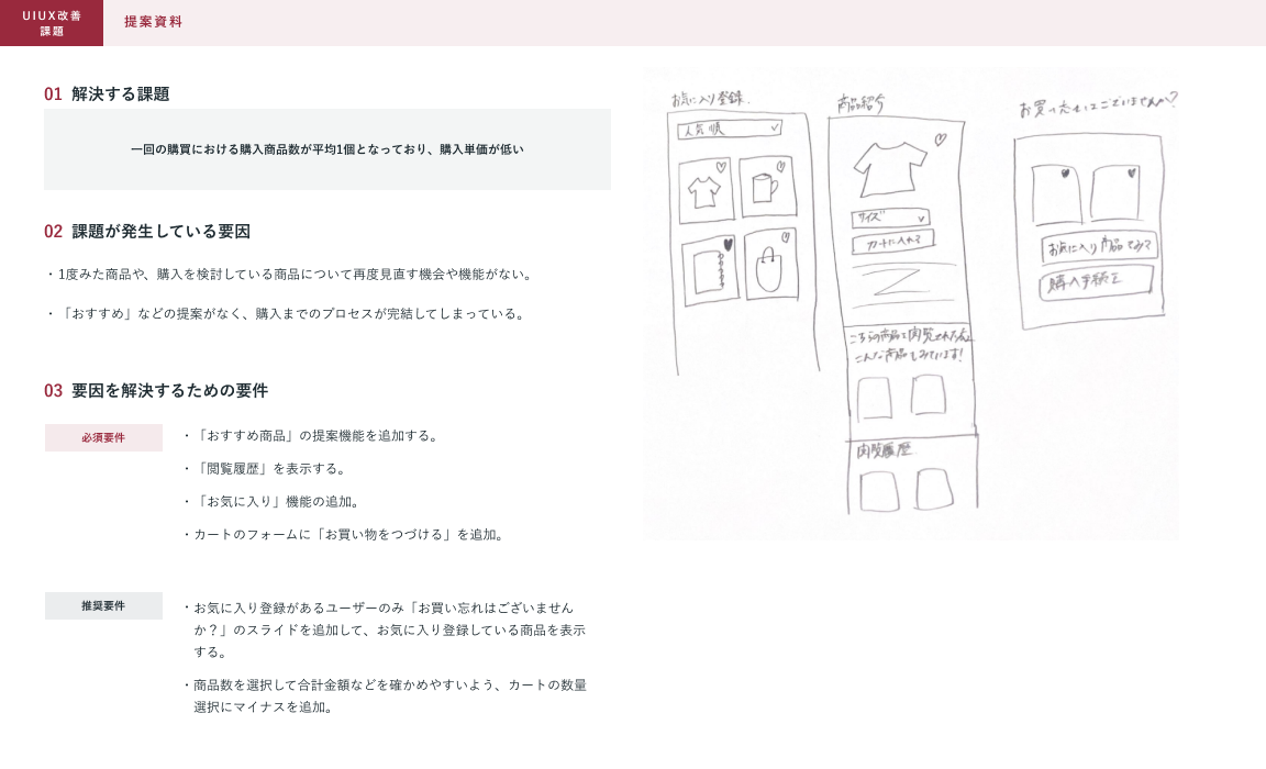 ECサイトの売り上げを伸ばすためにUIUX改善に取り組み、解決案を提案資料として作成してほしい。