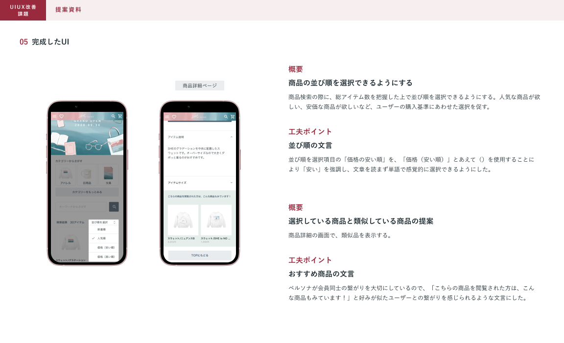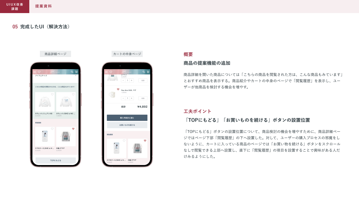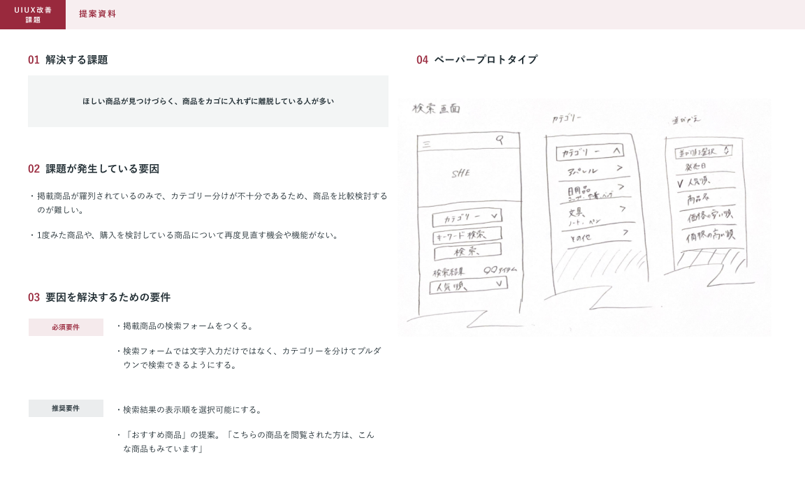 SHElikes MULTI CREATOR コースにて、架空ECサイトのUI/UX改善に取り組みました。クライアントの抱える課題に対して仮説要因を立て、解決アプローチを考え提案資料にまとめました。