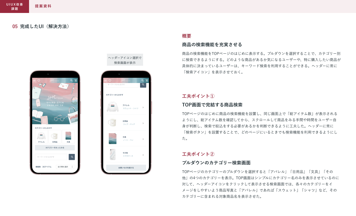 「ほしい商品が見つけづらく、商品をカゴに入れずに離脱している人が多い」という課題について、カテゴリー分けが不十分であるため、商品を比較検討するのが難しい点や、購入を検討している商品について再度見直す機会や機能がない点を課題だと考え、「商品の検索機能の充実」や「カテゴリーを分けて表示する機能」を追加しました。