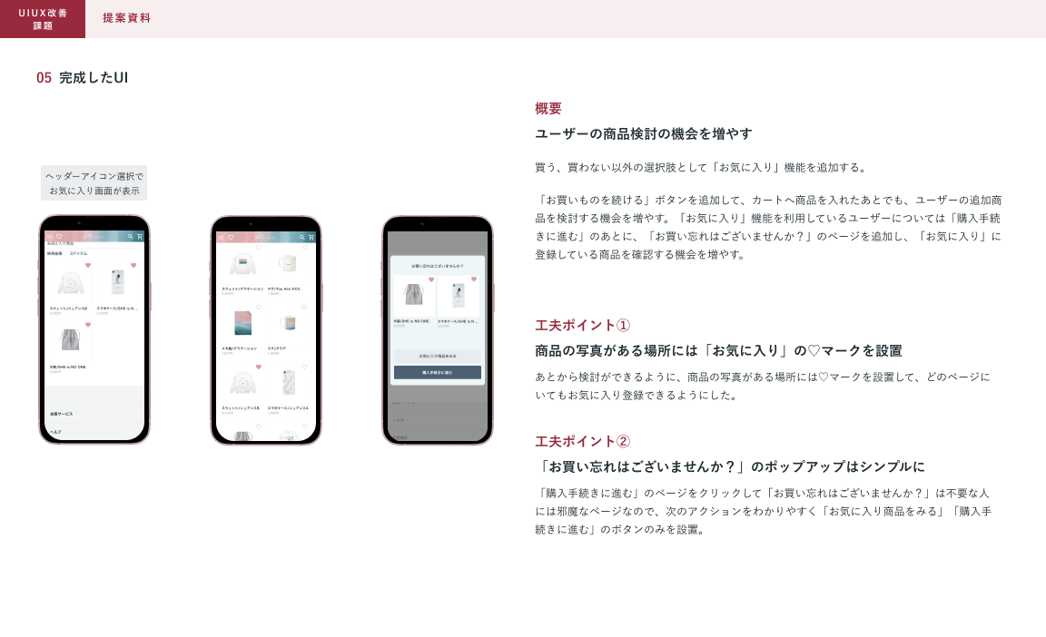 「1回の購買における購入商品数が平均1個となっており、購入単価が低い」という課題について、ユーザーが1度みた商品や、購入を検討している商品について再度見直す機会や機能がないことが課題だと考え、「お気に入り機能の追加」や「おすすめ商品の提案機能」を追加しました。